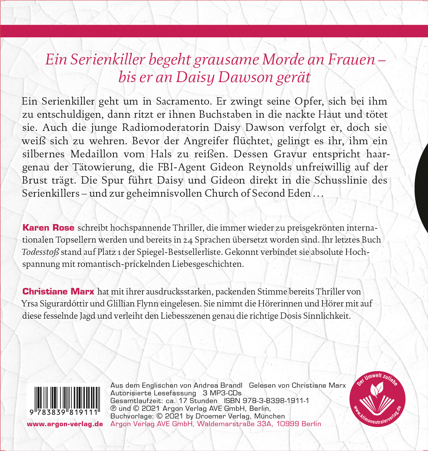 | Schlagworte | Amerikanischer Thriller • Christiane Marx • Church of Second Eden • Frauenmörder • Hörbuch von Karen Rose • Karen Rose Hörbücher • Neuerscheinung 2021 • Romantic Suspense • Romantischer Thriller • Sacramento-Reihe • Sekte • Serienkiller • Serienmörder • Spannungshörbuch • Thriller • Thriller Bestseller • weibliche Ermittlerin |