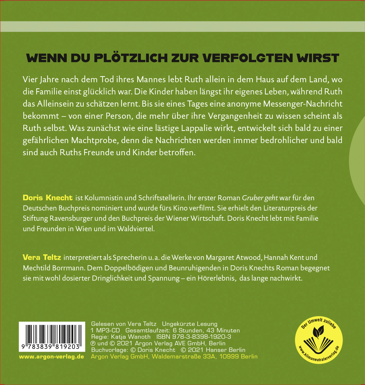 Doris Knecht ist eine hervorragende Beobachterin gegenwärtiger Lebenswirklichkeiten. Ein Hörbuch über ein brisantes Thema: medialer Hass gegen Frauen. Für Hörerinnen und Hörer von Juli Zeh und Melanie Raabe. Doris Knecht schreibt über eine Frau, die plötzlich zur Verfolgten wird, und erweist sich einmal mehr als virtuose Skeptikerin zwischenmenschlicher Beziehungen. Vera Teltz interpretiert als Sprecherin u. a. die Werke von Hannah Kent und Mechtild Borrmann. Gekonnt arbeitet sie Stimmungen und feine Nuancen heraus – die ideale Besetzung für Doris Knechts doppelbödigen Stoff.