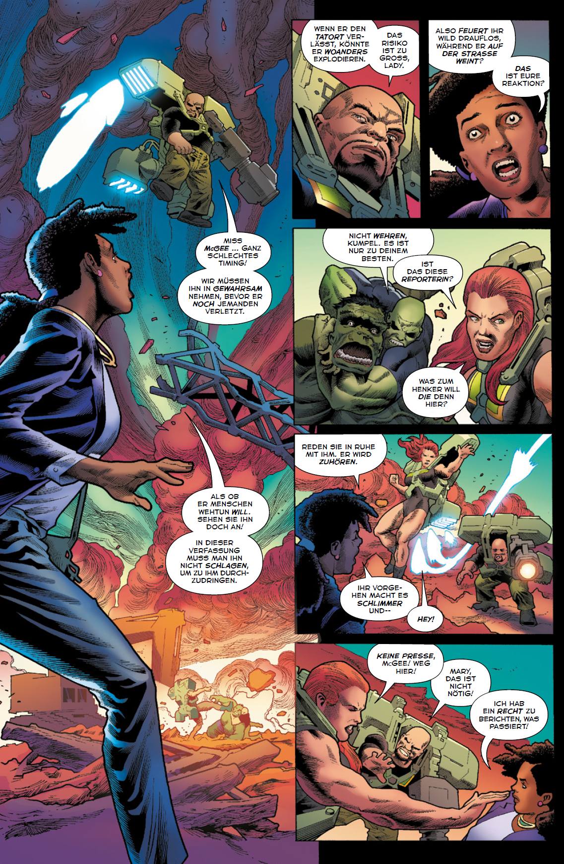 VOROWRT von Christian Endres Seit der schicksalhaften Explosion einer Gamma- Bombe sind die Existenzen von Dr. Bruce Banner und dem Hulk fest miteinander verbunden. In der gefeierten Serie BRUCE BANNER: HULK zelebrieren der britische Autor Al Ewing und der brasilianische Hauptzeichner Joe Bennett die gesamte Gamma-Mythologie und bringen sie mit innovativen Geschichten und großen Konzepten zugleich auf ein neues Level. Alles begann damit, dass Dr. Banner eine spezielle Form von Unsterblichkeit erlangte – denn wann immer Bruce starb, brachte ihn der anscheinend unsterbliche Hulk bei Nacht ins Leben zurück. Außerdem haben wir in den vorangegangenen Bänden dieser Serie erfahren, dass es am Boden der Realität, am Grundstein der Hölle, einen Ort namens Unter Allem gibt, der so etwas wie Hulks persönliche Hölle darstellt. Es ist das Reich von One Below All, der kosmischen Personifizierung und Macht der Zerstörung, der Wut und des Hasses – das finstere Gegenstück von One Above All. Gamma-Strahlung ermöglicht es dieser Macht, außerhalb ihres vom restlichen Multiverse abgeschotteten Reichs zu wirken, während grüne Tore zugleich einen Zugang zu dieser metaphysischen Wüste darstellen. Wie es aussieht, hat Hulks genialer Erzfeind Samuel Sterns alias Leader nicht nur Zugang zu Unter Allem, sondern sogar Macht über die Tore. Hulk und seine Gefährten um Doc Samson und Dr. Charlene McGowan, welche die Ausrüstung der früheren Regierungsabteilung Shadow Base nutzen, ahnen nichts von Leaders Manipulationen im Hintergrund. Sie glauben, ihr größtes Problem seien Hulks verschiedene Inkarnationen, die in Banners Bewusstseinswelt eingesperrt sind: der ruchlose Joe Fixit, der wilde Primitiv-Hulk, der Alien-Kriegsherr Grünnarbe und der monströse „Teufel-Hulk“. In der Realität, wo Pucks Heldenteam Alpha Flight nach dem Tod von Sasquatch durch Titania und Absorbing Man verstärkt wird, explodierte der Hulk zuletzt bei einer Pressekonferenz, weil Leader Hulks mutierten besten Freund Rick Jones mit Gamma- Strahlung überladen hatte …
