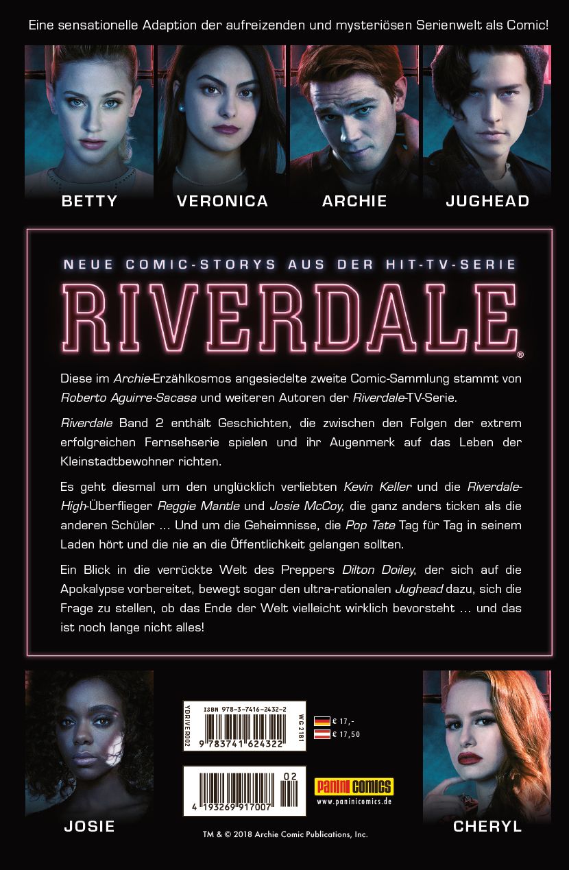 NEUE COMIC-STORYS AUS DER HIT-TV-SERIE RIVERDALEDiese im Archie-Erzählkosmos angesiedelte zweite Comic-Sammlung stammt von Roberto Aguirre-Sacasa und weiteren Autoren der Riverdale-TV-Serie.Riverdale Band 2 enthält Geschichten, die zwischen den Folgen der extrem erfolgreichen Fernsehserie spielen und ihr Augenmerk auf das Leben der Kleinstadtbewohner richten.Es geht diesmal um den unglücklich verliebten Kevin Keller und die Riverdale-High-Überflieger Reggie Mantle und Josie McCoy, die ganz anders ticken als die anderen Schüler ... Und um die Geheimnisse, die Pop Tate Tag für Tag in seinem Laden hört und die nie an die Öffentlichkeit gelangen sollten.Ein Blick in die verrückte Welt des Preppers Dilton Doiley, der sich auf die Apokalypse vorbereitet, bewegt sogar den ultra-rationalen Jughead dazu, sich die Frage zu stellen, ob das Ende der Welt vielleicht wirklich bevorsteht ... und das ist noch lange nicht alles!