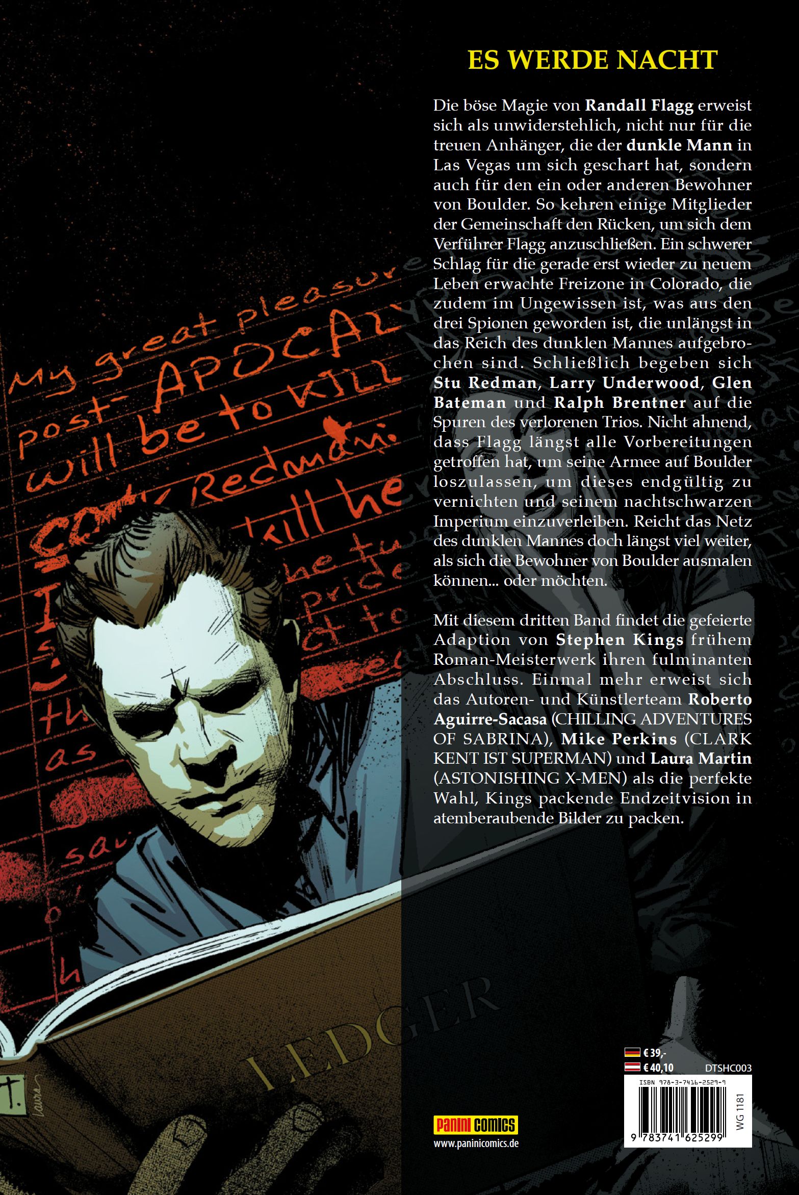 ES WERDE NACHTDie böse Magie von Randall Flagg erweist sich als unwiderstehlich nicht nur für die treuen Anhänger, die der dunkle Mann in Las Vegas um sich geschart hat, sondern auch für den ein oder anderen Bewohner von Boulder. So kehren Nadine Cross und Harold Lauder der Gemeinschaft den Rücken, um sich dem Verführer Flagg anzuschließen. Ein schwerer Schlag für die gerade erst wieder zu neuem Leben erwachte Freizone in Colorado, die zudem im Ungewissen ist, was aus den drei Spionen geworden ist, die unlängst in das Reich des dunklen Mannes aufgebrochen sind. Schließlich begeben sich Stu Redman, Larry Underwood, Glen Bateman und Ralph Brentner auf die Spuren des verlorenen Trios. Nicht ahnend, dass Flagg längst alle Vorbereitungen getroffen hat, um seine Armee auf Boulder loszulassen, um dieses endgültig zu vernichten und seinem nachtschwarzen Imperium einzuverleiben. Reicht das Netz des dunklen Mannes doch längst viel weiter, als sich die Bewohner von Boulder ausmalen können... oder möchten.Mit diesem dritten Band findet die gefeierte Adaption von Stephen Kings frühem Roman-Meisterwerk ihren fulminanten Abschluss. Einmal mehr erweist sich das Autoren- und Künstlerteam Roberto Aguirre-Sacasa (CHILLING ADVENTURES OF SABRINA), Mike Perkins (CLARK KENT IST SUPERMAN) und Laura Martin (ASTONISHING X-MEN) als die perfekte Wahl, Kings packende Endzeitvision in atemberaubende Bilder zu packen.