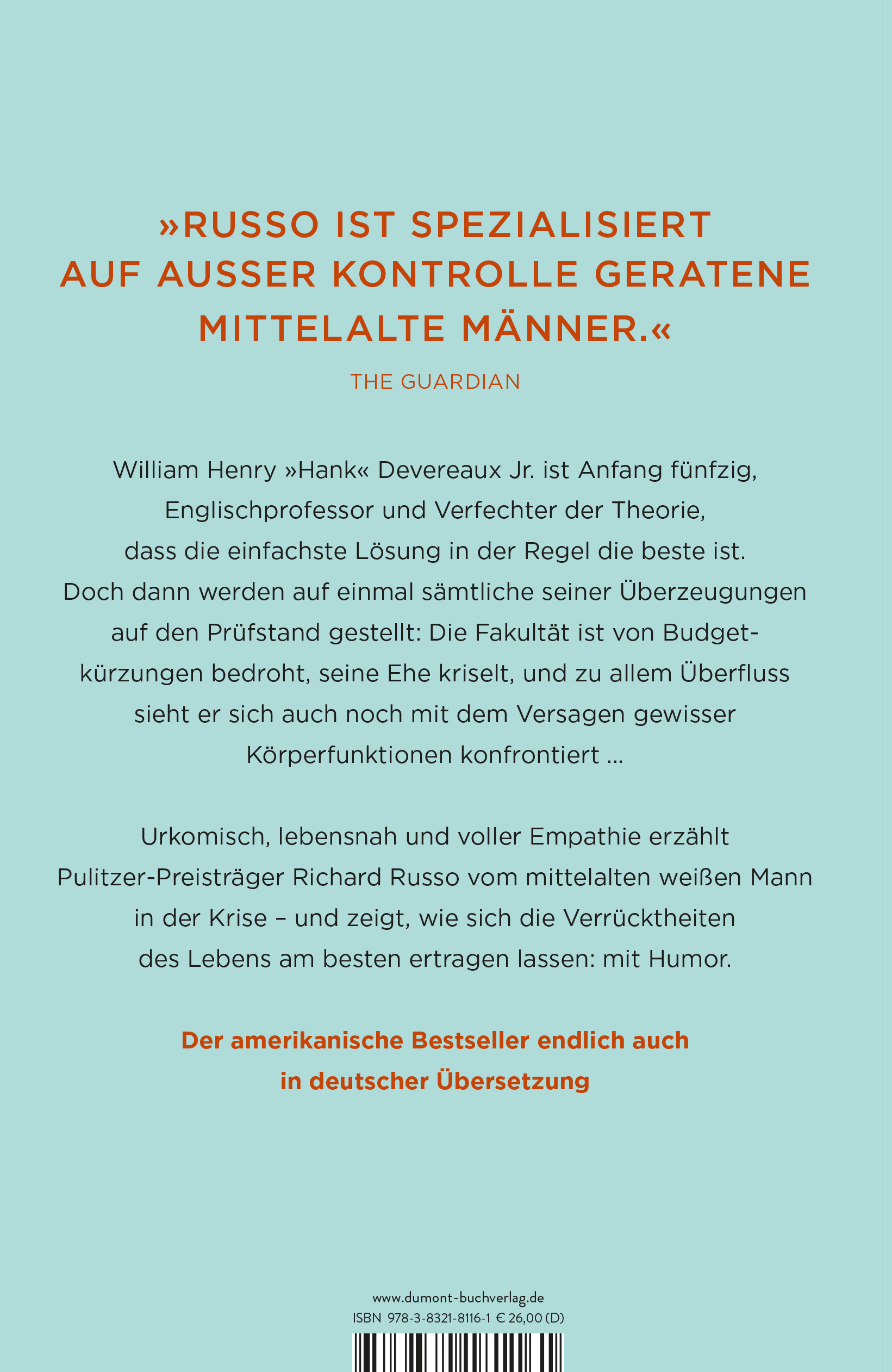 ›Mittelalte Männer‹ ist die Charakterstudie eines Mannes um die fünfzig, der gern den Weg des geringsten Widerstands geht und schließlich doch einsehen muss, dass ihm nichts anderes übrig bleibt, als Verantwortung zu übernehmen. Ein hochkomischer Roman, der die Absurdität des Lebens illustriert, aber auch Raum lässt für abgründige Beobachtungen – ein klassischer Russo mit Herz, Hintersinn und Humor.
