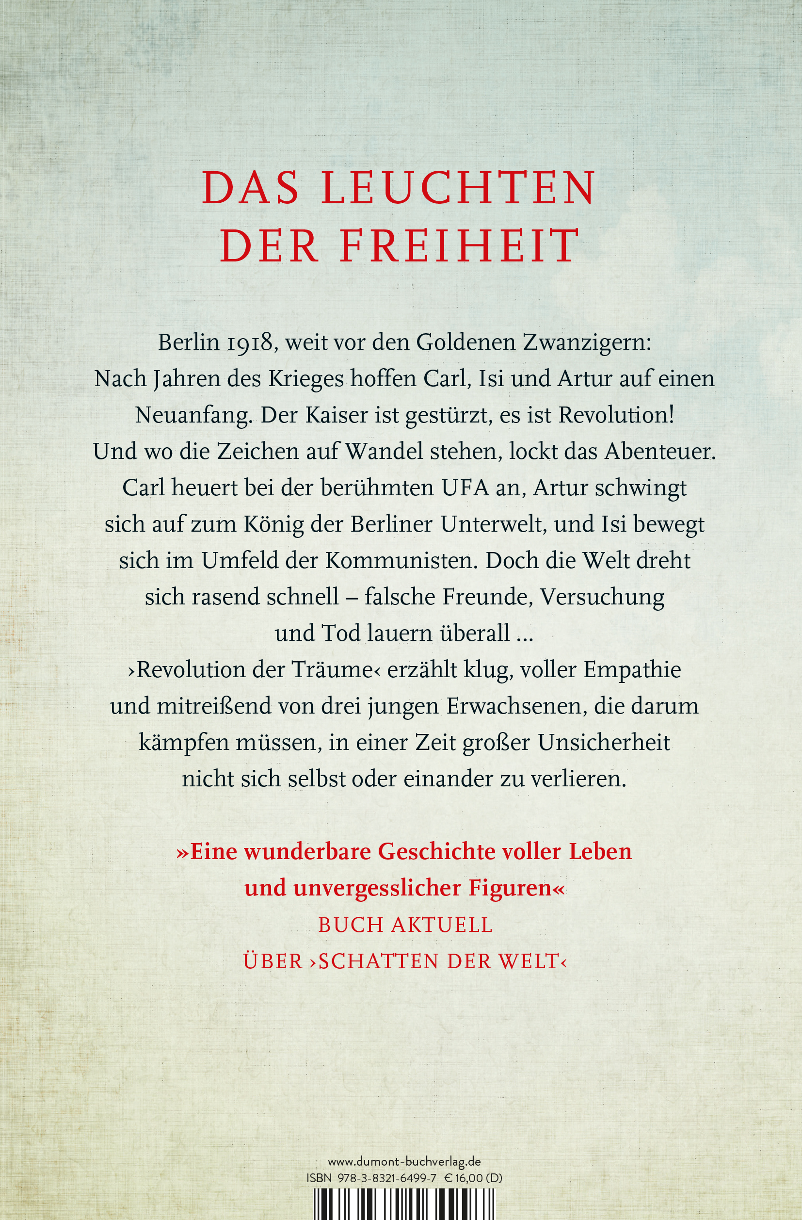 | Schlagworte | Abenteuer • Aufstand • Babylon Berlin • Berlin • Berliner Geschichte • berlin vor den goldenen zwanzigern • Demokratie • der traumpalast • Deutsche Geschichte • eine familie in deutschland • Ernst Lubitsch • Erster Weltkrieg • Familie • Fräulein Gold • Freiheit • Freundschaft • Fritz Lang • frühe weimarer republik • Geschichte • Geschichte des Films • glücksbüro • Historischer Roman • Historische Unterhaltung • Jeffrey Archer • Ken Follet • Kino • Lehrerin einer neuen Zeit • Liebesgeschichte • matrosen-aufstand • neunzehnhundertachtzehn • Peter Prange • Rebellion • Revolution • schatten der Welt • Schicksal • Schicksalsroman • spannend • Spartakus-Aufstand • Starke Frauen • traumtänzer • Ufa • Unterhaltung • Weimarer Republik • Zwanzigerjahre • Zwanzigstes Jahrhundert • Zweiter Weltkrieg |