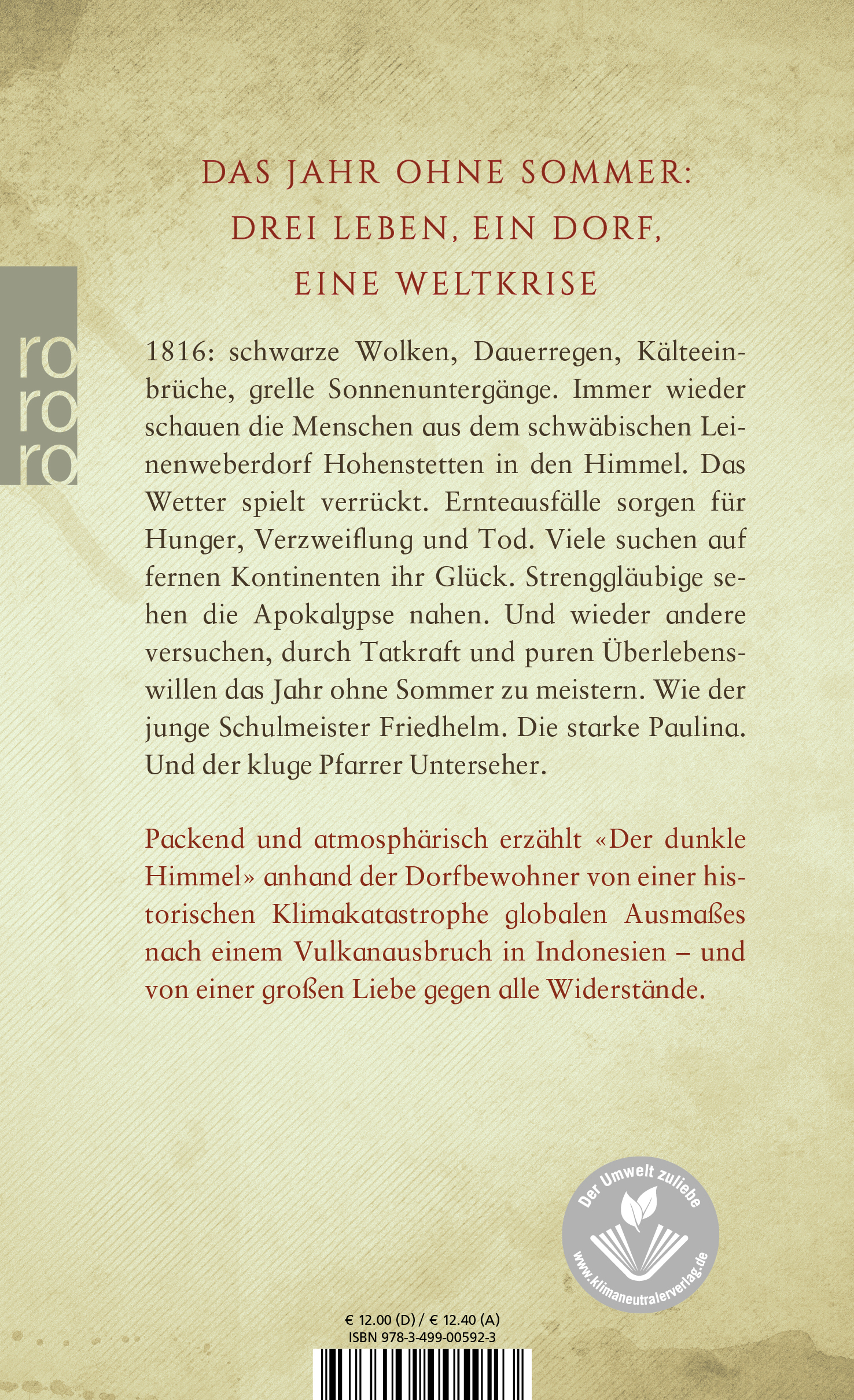 Drei Leben, ein Dorf, eine Weltkrise. Eine Aschewolke hängt über Europa: Nach «Turm aus Licht» erzählt die Bestsellerautorin Astrid Fritz das berühmte, schicksalhafte Jahr 1816, das «Jahr ohne Sommer», als großen packenden Roman - und als berührende Liebesgeschichte. Packend und atmosphärisch erzählt «Der dunkle Himmel» anhand des Leinenweberdorfes von einer historischen Klimakatastrophe globalen Ausmaßes nach einem Vulkanausbruch in Indonesien. Nach dem Bestseller «Turm aus Licht» nun ein Roman über eine globale Klimakatastrophe für Leser*innen von Jeffrey Archer und Ken Follett.