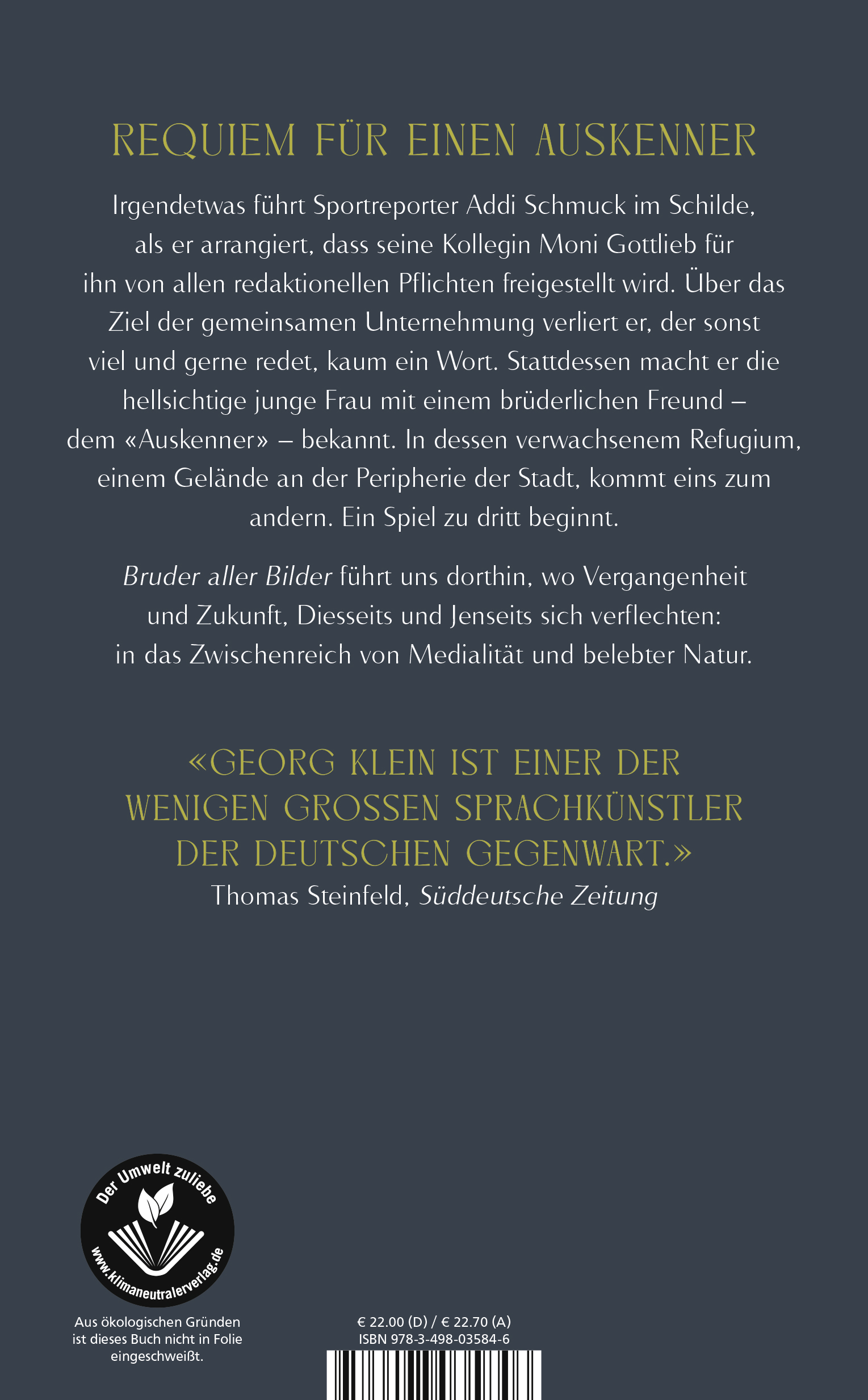 Kaum ein Schriftsteller unserer Zeit handhabt die Mittel der erzählenden Literatur subtiler als Georg Klein, kaum einer treibt das Spiel mit größerem Vergnügen und Eigensinn voran. Sein neuer Roman führt uns in die Redaktion einer traditionsreichen süddeutschen Regionalzeitung — und in das Zwischenreich von Medialität und belebter Natur. Eine dunkle Komödie in leuchtender Prosa. Ein anrührend humanes Trio auf der Suche nach Heilung und Trost. «Bruder aller Bilder» ist ein hochbewusstes Spiel mit dem dunklen Genre; wie schon der preisgekrönte «Roman unserer Kindheit» angesiedelt in Georg Kleins Geburtsstadt Augsburg.
