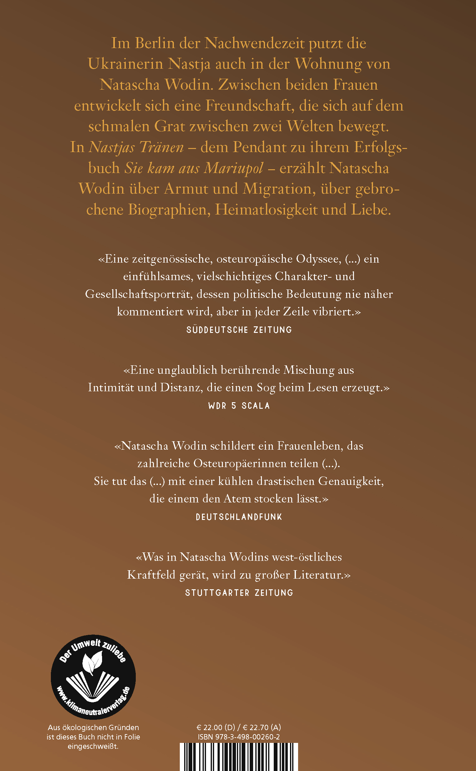 Das Pendant zum Bestseller «Sie kam aus Mariupol» − ein Frauenschicksal jetzt und hier. Über Herkunft, Heimatlosigkeit und brüchige Biographien. Über Freundschaft, Geborgenheit und Liebe. Für Natascha Wodin ist es, als würde sie von ihrem Schicksal erneut eingeholt. Im Heimweh dieser Ukrainerin, mit der sie mehr und mehr eine Freundschaft verbindet, erkennt sie das Heimweh ihrer Mutter wieder, die daran früh zerbrochen ist. Jetzt, Jahre später, zeichnet sie mit verhaltener, tief anrührender Poesie das Porträt von Nastja, einer kämpferischen Frau.