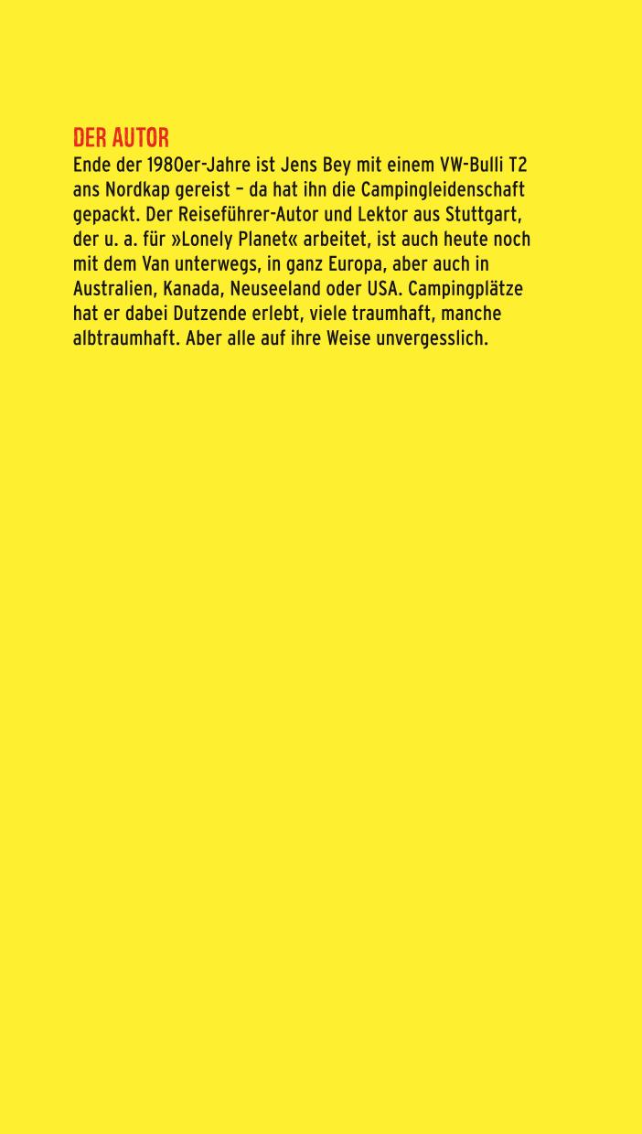 Ende der 1980er-Jahre ist Jens Bey mit einem VW-Bulli T2 ans Nordkap gereist – da hat ihn die Campingleidenschaft gepackt. Der Reiseführer-Autor und Lektor aus Stuttgart, der u. a. für „Lonely Planet“ arbeitet, ist auch heute noch mit dem Van unterwegs, in ganz Europa, aber auch in Australien, Kanada, Neuseeland oder USA. Campingplätze hat er dabei Dutzende erlebt, viele traumhaft, manche albtraumhaft. Aber alle auf ihre Weise unvergesslich.