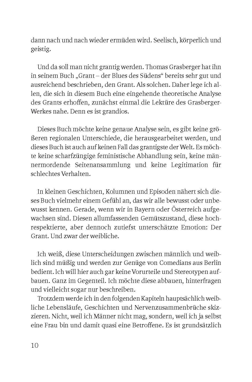 In kurzen Sequenzen beschreibt Eva Karl Faltermeier die Schönheit (bayerisch-)femininer Ausnahmezustände. Und diese Geschichten sind schwer unterhaltsam. Denn wenn es knirscht im Gebälk des Lebens, dann liegen Tragik und Komik oft nah beieinander. Und die Brücke zwischen diesen beiden ist: der Grant. Und weil es ja nicht sein kann, dass grantige Männer trotzdem noch als gemütlich gelten, während grantigen Frauen „Haare auf den Zähnen“ nachgesagt werden, hat die Autorin dem weiblichen Grant mit diesem Buch ein Denkmal gesetzt. So charmant wie in diesem Buch, da seien Sie versichert, wurde der weibliche Grant noch nie beleuchtet!