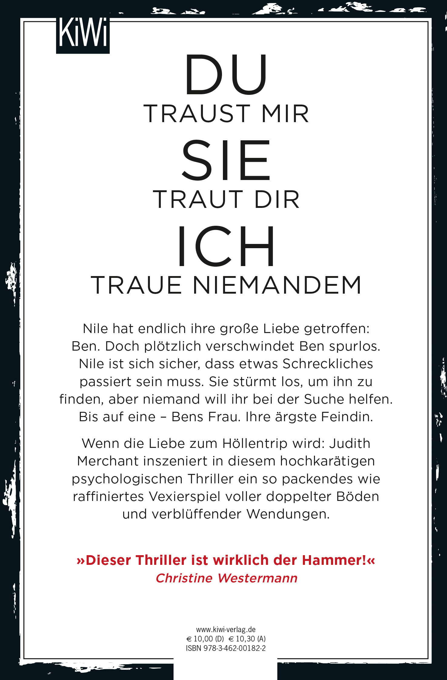 Nile hat endlich ihre große Liebe gefunden: Ben. Doch plötzlich verschwindet Ben spurlos. Und niemand will Nile bei der Suche helfen. Bis auf eine - seine Frau. Ihre ärgste Feindin. Eben noch war Ben in der Boutique, in der Nile ein Kleid anprobierte, doch als sie aus der Umkleidekabine kommt, ist er verschwunden. Nile ist sich sicher: Es muss etwas Schreckliches passiert sein. Aber niemand will ihr glauben. Noch nicht mal seine engsten Freunde, die Nile sowieso für zu anhänglich halten. Also muss sie ausgerechnet ihre größte Feindin um Hilfe bitten: Flo, die Frau, mit der Ben noch verheiratet ist. Zu Niles Erstaunen ist diese sehr kooperativ. Doch dann entdecken die beiden Frauen immer mehr Ungereimtheiten in Bens Leben. Und die gemeinsam begonnene Suche entwickelt sich zu einer atemlosen Jagd, denn Nile realisiert: In diesem perfiden Spiel kann sie niemandem trauen. Schon gar nicht Flo. Judith Merchant inszeniert in diesem hochkarätigen Thriller ein so packendes wie raffiniertes psychologisches Vexierspiel voller doppelter Böden und verblüffender Wendungen.