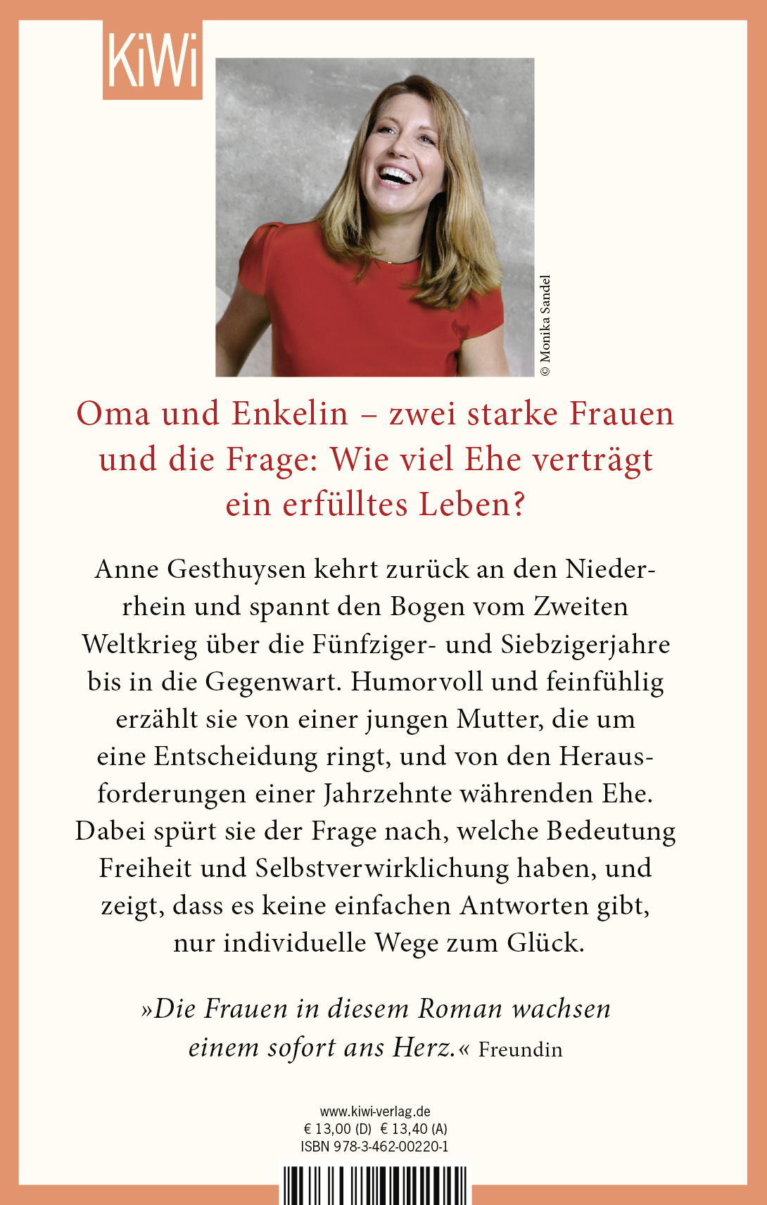 Eine Ehe steht nach fünfundsechzig Jahren vor dem Aus - und eine junge Mutter ringt um eine Entscheidung, die nicht nur ihr Leben bestimmen wird. In ihrem neuen Roman kehrt Anne Gesthuysen zurück an den Niederrhein und spannt den Bogen vom Zweiten Weltkrieg über die piefigen Fünfziger- und die wilden Siebzigerjahre bis in die Gegenwart. Dabei spürt sie der Frage nach, welche Bedeutung Freiheit und Selbstverwirklichung haben, und zeigt, dass es keine einfachen Antworten gibt, nur individuelle Wege zum Glück.