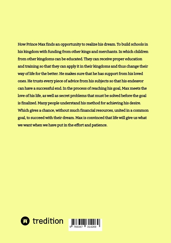 How Prince Max realized his dream. With his correct thinking and acting he fulfils his goal. His method gives many people without financial means the opportunity to behave like him and fulfil their desires. This path continues to this day. Confidently on the way to the goal, Max meets the love of his life, Princess Mary. He is sure that life will give what we want when we use the real wealth we have.