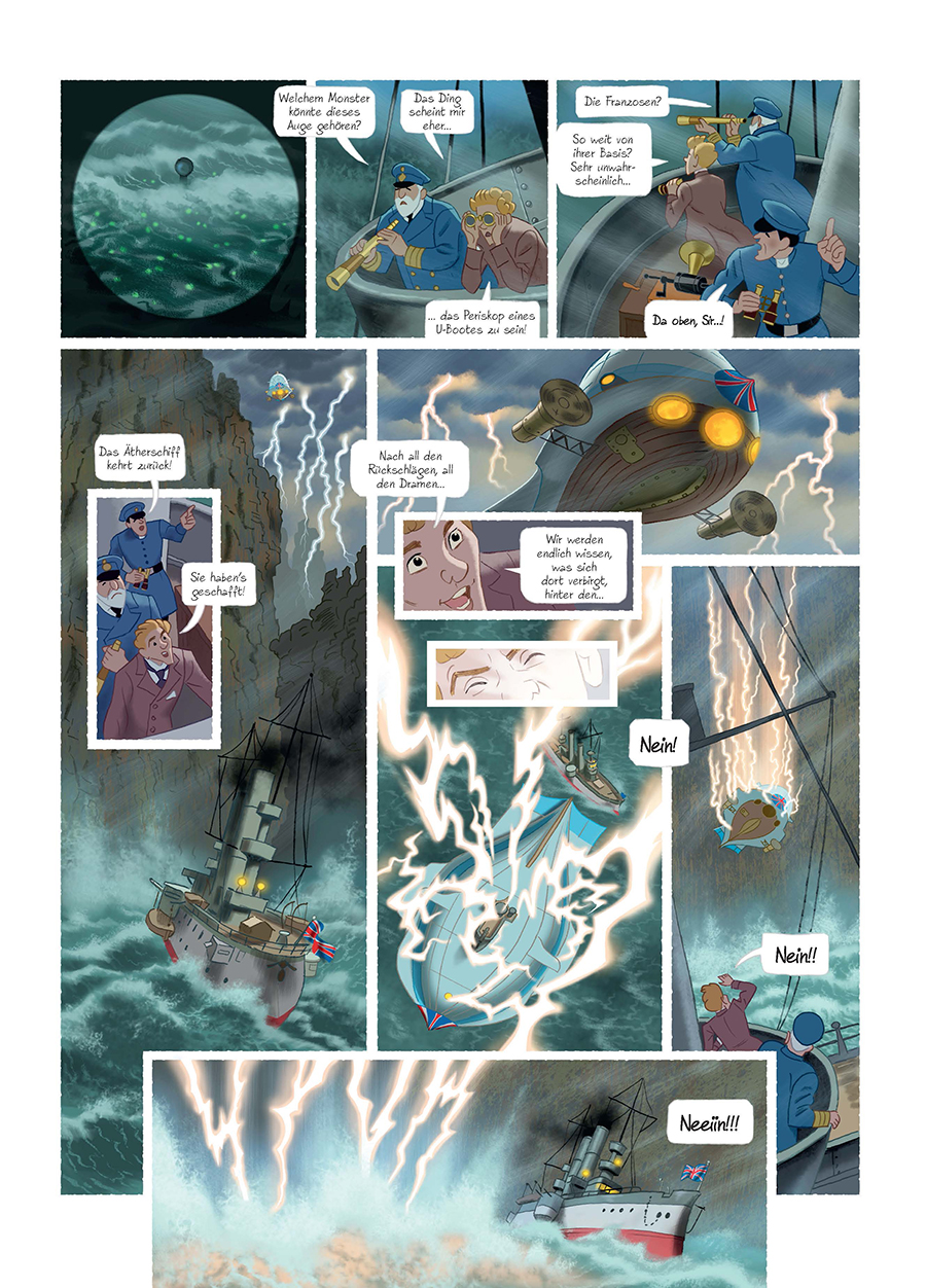 Im Jahre 1874 ist es den Großmächten der Erde gelungen, den Äther zu bändigen und an Bord grandioser Schiffe den Weltraum zu erobern. Entdecker, Pioniere und Geschäftsleute streben gen Himmel auf der Suche nach Abenteuern und Profit. Der gefeierten Schauspielerin Hélène Martin gelingt es, einen Platz an Bord der »Excelsior« zu ergattern, die Kurs auf den nebelverhangenen, ungezähmten Planeten Venus nimmt. Dort sitzt ihr Verlobter, ein Dichter, der Napoleon III. ein Dorn im Auge ist, in einem Straflager ein - und Hélène ist wild entschlossen, ihn zu retten!In diesem unabhängigen Spin-off zum modernen Meisterwerk »Das Schloss in den Sternen« von Alex Alice lässt Texter Alain Ayroles (»Der große Indienschwindel«) seiner Fabulierlust freien Lauf: Weltraumzeppeline! Politkomplotte! Liebesdramen! Dinosaurier! Ein Glück, dass Étienne Jungs farbenfroher Stil so herrlich verspielt wie detailverliebt ist und uns somit eine Comic-Trilogie sondergleichen beschert.