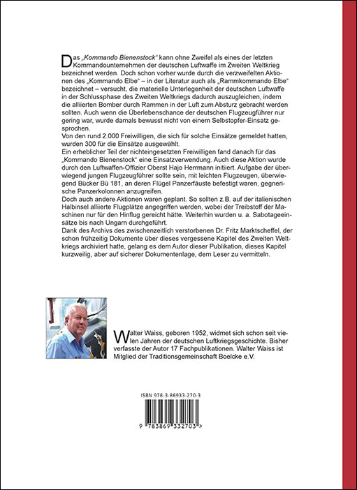 Das "Kommando Bienenstock" kann ohne Zweifel als eines der letzten Kommandounternehmen der deutschen Luftwaffe im Zweiten Weltkrieg bezeichnet werden. Doch schon vorher wurde durch die verzweifelten Aktionen des "Kommando Elbe" - in der Literatur auch als "Rammkommando Elbe" bezeichnet - versucht, die materielle Unterlegenheit der deutschen Luftwaffe in der Schlussphase des Zweiten Weltkriegs dadurch auszugleichen, indem die alliierten Bomber durch Rammen in der Luft zum Absturz gebracht werden sollten. Auch wenn die Überlebenschance der deutschen Flugzeugführer nur gering war, wurde damals bewusst nicht von einem Selbstopfer-Einsatz gesprochen.Von den rund 2.000 Freiwilligen, die sich für solche Einsätze gemeldet hatten, wurden 300 für die Einsätze ausgewählt.Ein erheblicher Teil der nichteingesetzten Freiwilligen fand danach für das "Kommando Bienenstock" eine Einsatzverwendung. Auch diese Aktion wurde durch den Luftwaffen-Offizier Oberst Hajo Herrmann initiiert. Aufgabe der überwiegend jungen Flugzeugführer sollte sein, mit leichten Flugzeugen, überwiegend Bücker Bü 181, an deren Flügel Panzerfäuste befestigt waren, gegnerische Panzerkolonnen anzugreifen.Doch auch andere Aktionen waren geplant. So sollten z.B. auf der italienischen Halbinsel alliierte Flugplätze angegriffen werden, wobei der Treibstoff der Maschinen nur für den Hinflug gereicht hätte. Weiterhin wurden u. a. Sabotageeinsätze bis nach Ungarn durchgeführt.Dank des Archivs des zwischenzeitlich verstorbenen Dr. Fritz Marktscheffel, der schon frühzeitig Dokumente über dieses vergessene Kapitel des Zweiten Weltkriegs archiviert hatte, gelang es dem Autor dieser Publikation, dieses Kapitel kurzweilig, aber auf sicherer Dokumentenlage, dem Leser zu vermitteln.