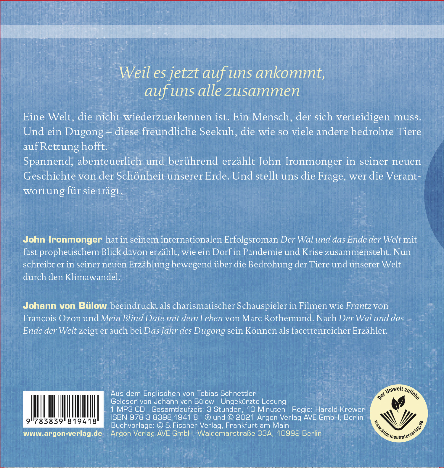 Ganz neu: Die bewegende kurze Erzählung über Klima und bedrohte Tiere vom Autor des Platz-1-Bestsellers »Der Wal und das Ende der Welt«. Spannend und berührend erzählt John Ironmonger in seiner neuen kurzen Geschichte von der Schönheit unserer Erde – und stellt uns die Frage, wer die Verantwortung für sie trägt. Eine Novelle für unsere Zeit, abenteuerlich und aktuell.
