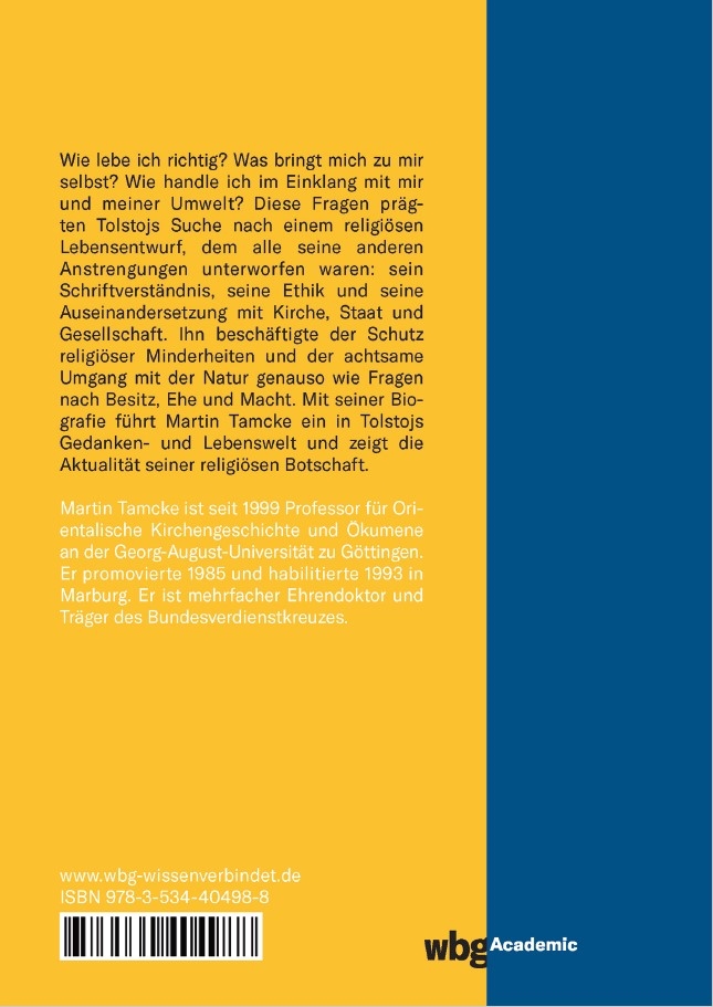 Wie lebe ich richtig? Was bringt mich zu mir selbst? Wie handle ich im Einklang mit mir und meiner Umwelt? Diese Fragen prägten Tolstojs Suche nach einem religiösen Lebensentwurf, dem alle seine anderen Anstrengungen unterworfen waren: sein Schriftverständnis, seine Ethik und seine Auseinandersetzung mit Kirche, Staat und Gesellschaft. Ihn beschäftigte der Schutz religiöser Minderheiten und der achtsame Umgang mit der Natur genauso wie Fragen nach Besitz, Ehe und Macht. Tolstojs unangepasste Religiosität hatte großen Einfluss: Gandhis gewaltloser Widerstand erhielt Impulse durch sie, Albert Schweitzer war von Tolstojs unmittelbarer Aufnahme biblischer Lehre fasziniert. Mit seiner Biografie führt Martin Tamcke ein in Tolstojs Gedanken- und Lebenswelt und zeigt die Aktualität seiner religiösen Botschaft.