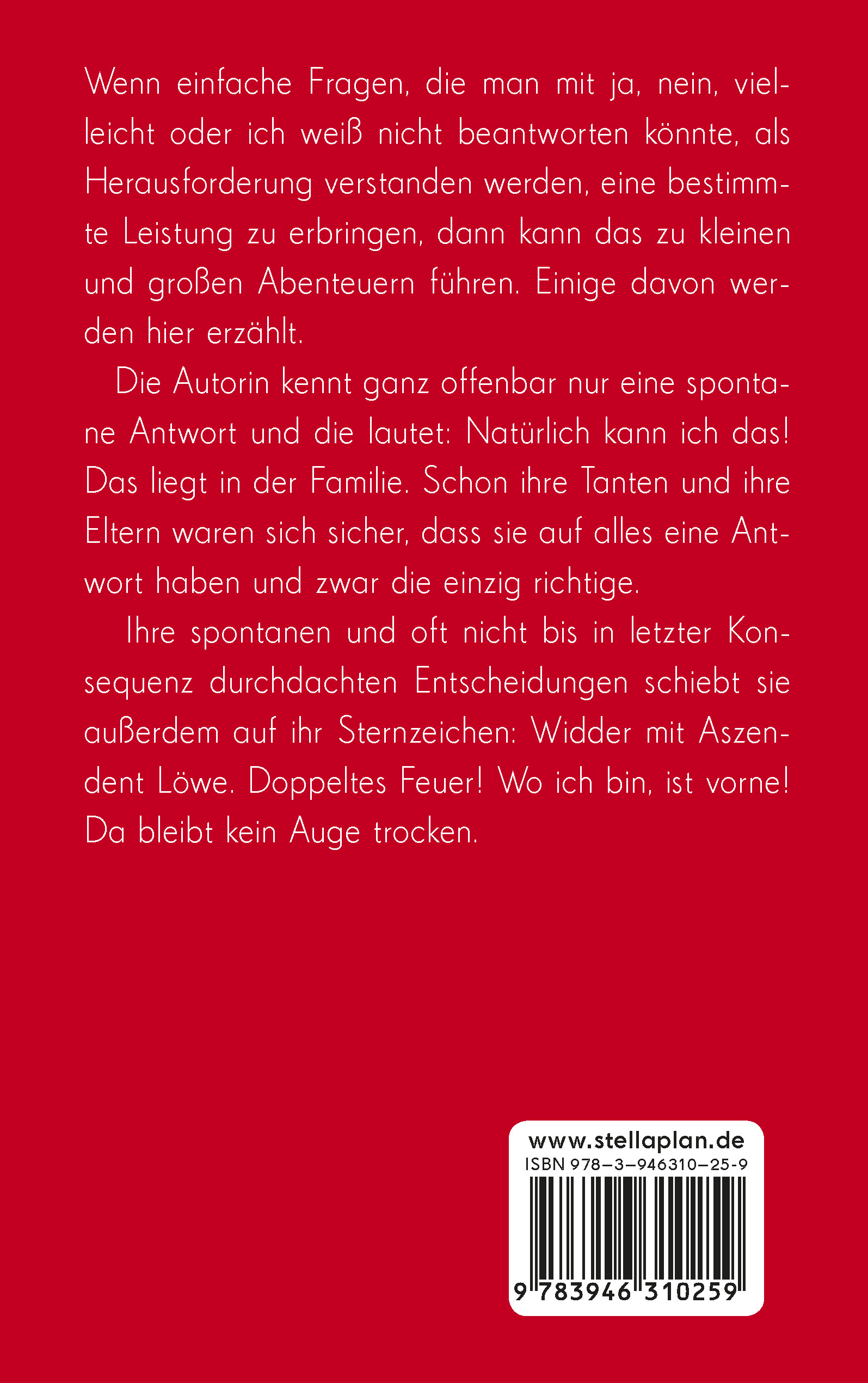 Die Autorin kennt ganz offenbar nur eine spontane Antwort und die lautet: Natürlich kann ich das! Das liegt in der Familie. Schon ihre Tanten und ihre Eltern waren sich sicher, dass sie auf alles eine Antwort haben und zwar die einzig richtige.