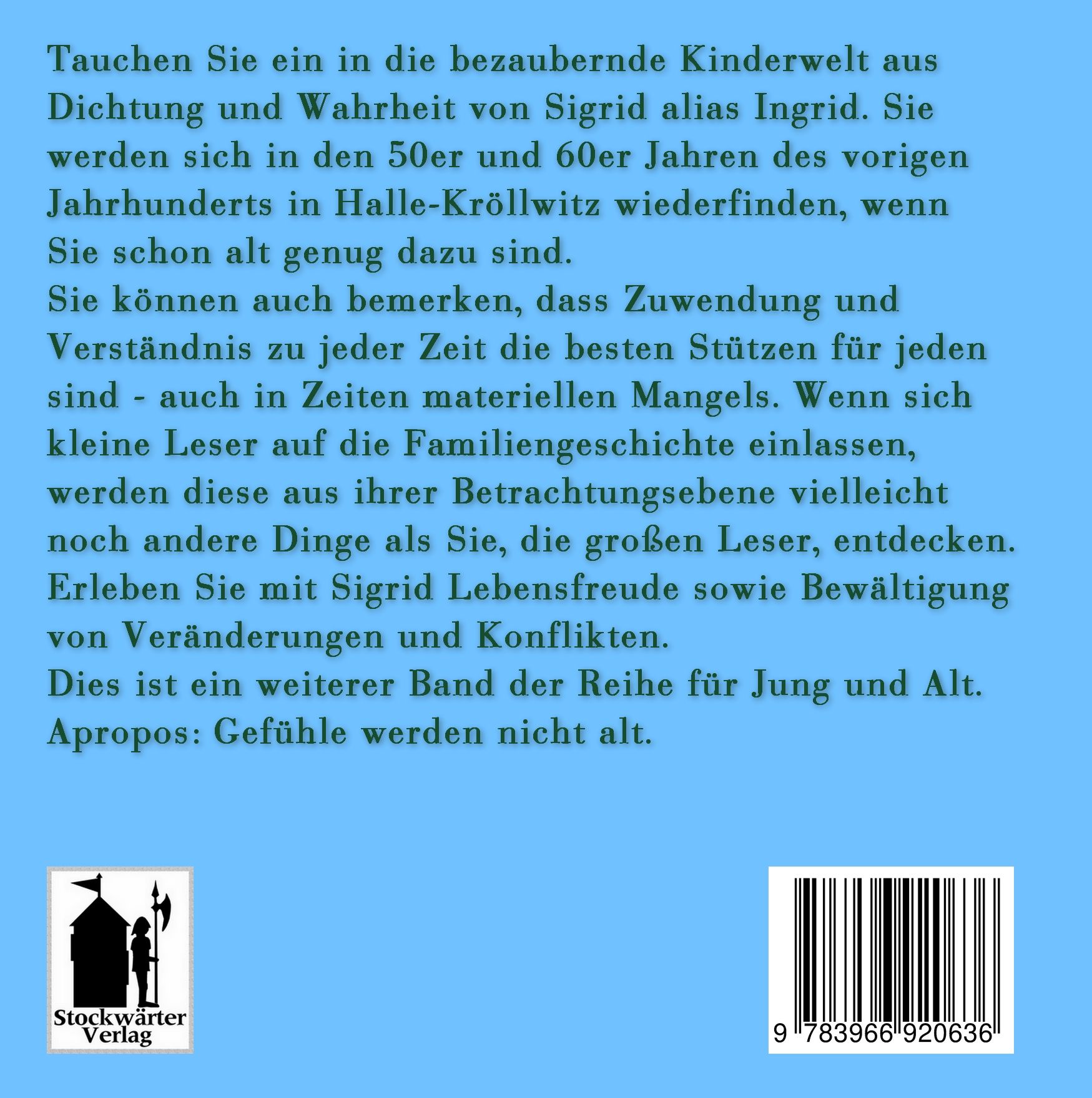 Sie können auch bemerken, dass Zuwendung und Verständnis zu jeder Zeit die besten Stützen für jeden sind - auch in Zeiten materiellen Mangels. Wenn sich kleine Leser auf die Familiengeschichte einlassen, werden diese aus ihrer Betrachtungsebene vielleicht noch andere Dinge als Sie, die großen Leser, entdecken. Erleben Sie mit Sigrid Lebensfreude sowie Bewältigung von Veränderungen und Konflikten.