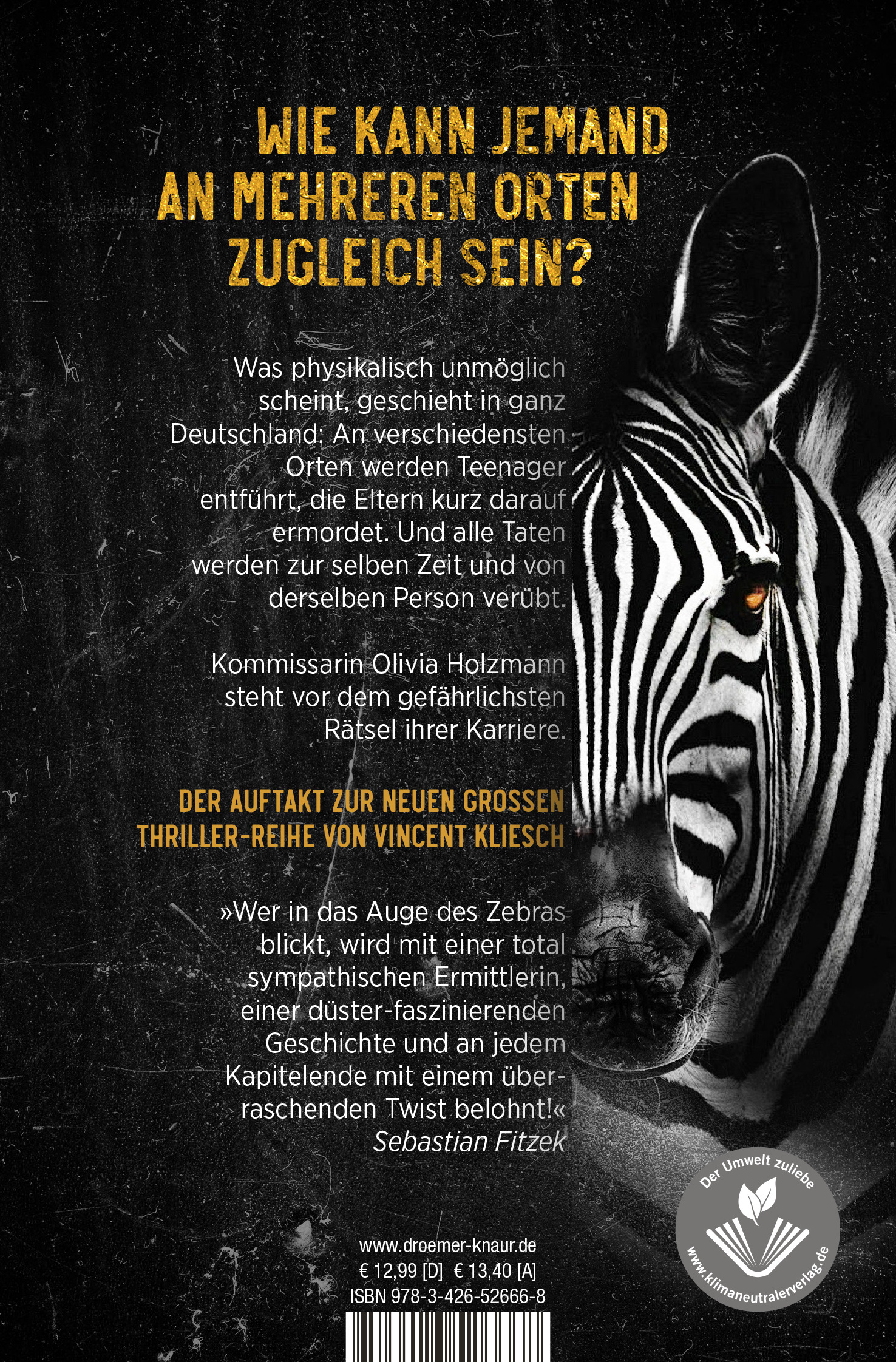 Wie kann eine Person an mehreren Orten zugleich sein? Im Reihen-Auftakt »Im Auge des Zebras« von Bestsellerautor Vincent Kliesch muss Kommissarin Olivia Holzmann einen Fall lösen, den es gar nicht geben kann. Ermittler Severin Boesherz übergibt den Staffelstab an seine unerschrockene Nachfolgerin: Vorhang auf für LKA-Kommissarin Olivia Holzmann aus Berlin! Ein genialer Psychopath, ein unmöglicher Fall und unvorhersehbare Twists: Der deutsche Thriller-Autor Vincent Kliesch, der u .a. mit der »Auris«-Reihe zusammen mit Sebastian Fitzek immer wieder die Bestsellerliste stürmt, wird seinen Lesern mit der neuen Ermittlerin Olivia Holzmann viele schlaflose Nächte bescheren!