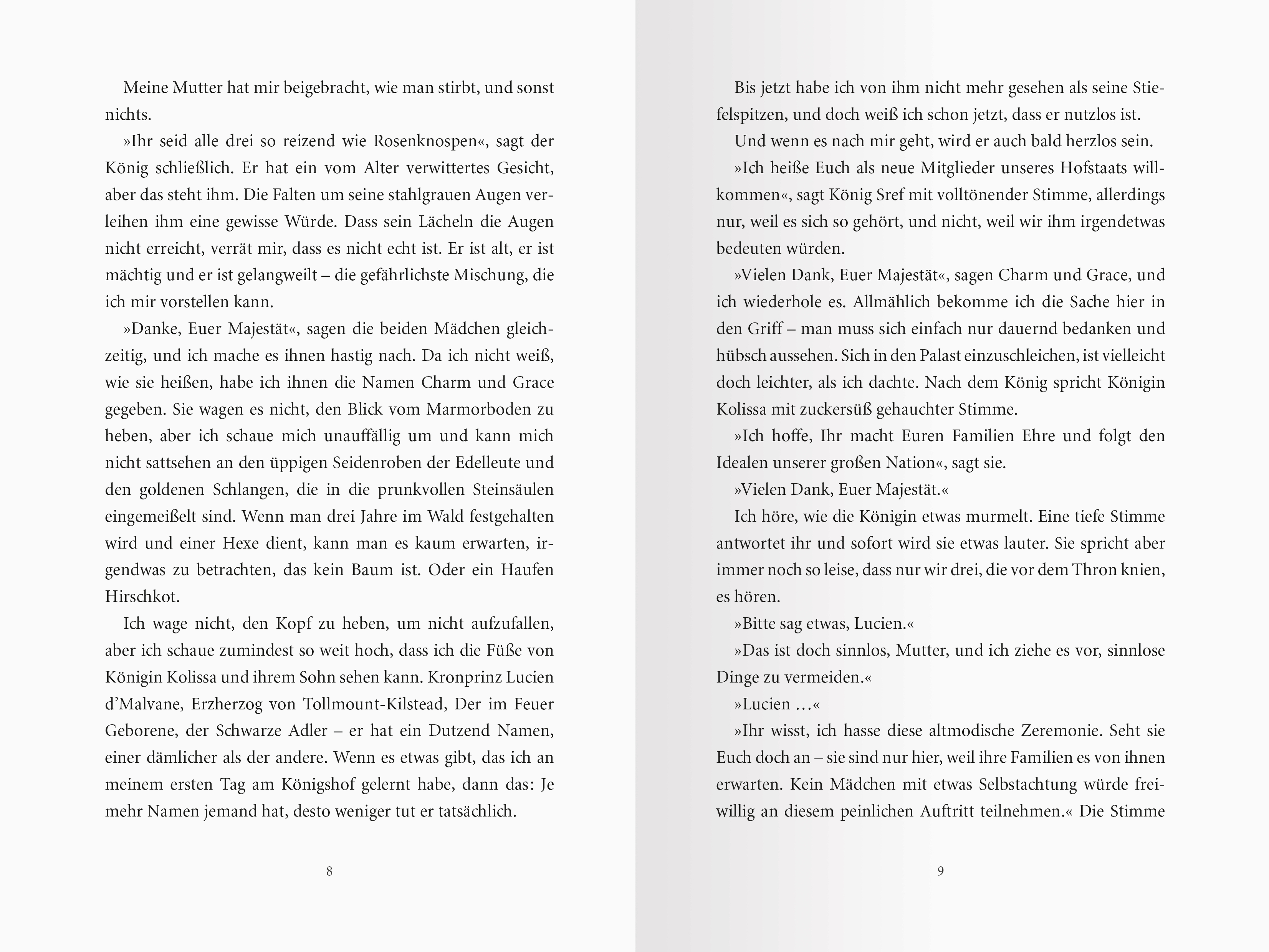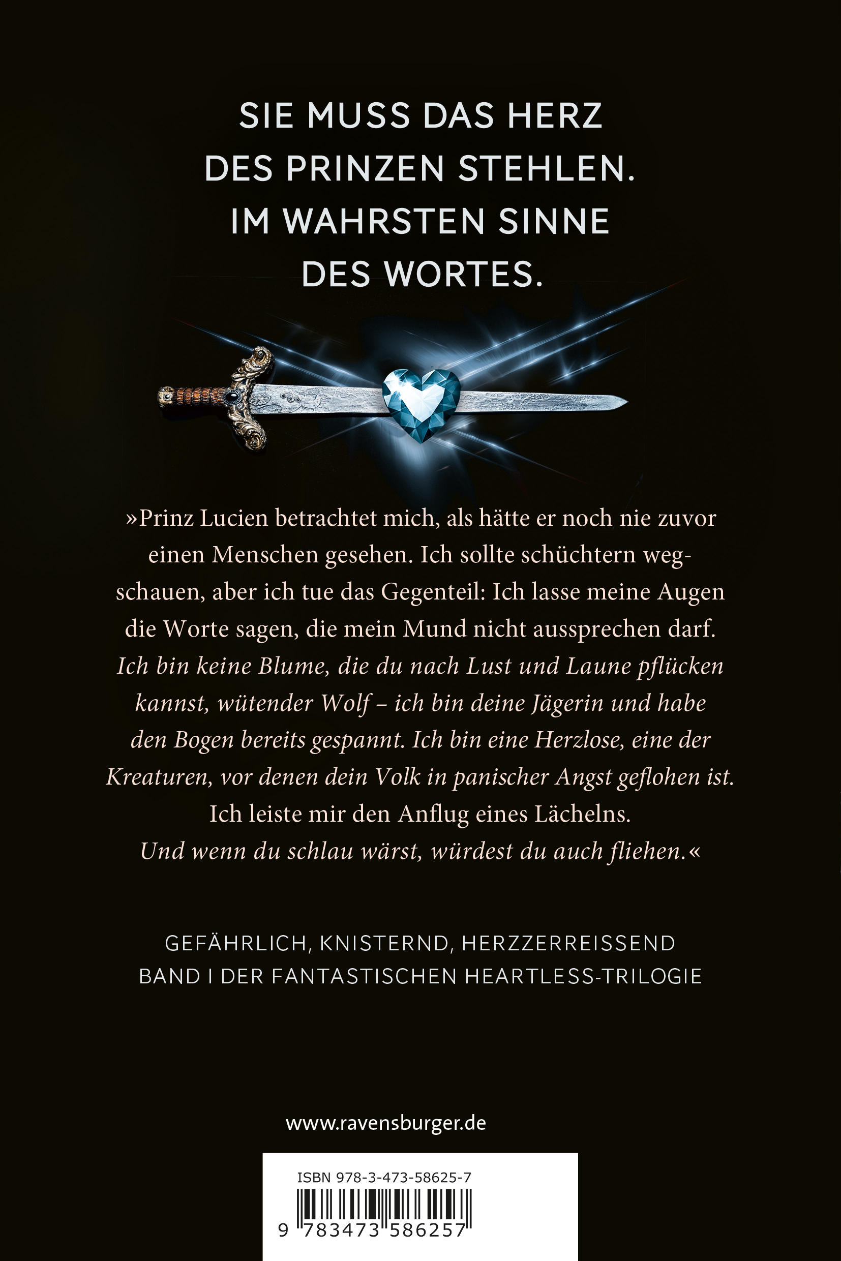 Wieder blicke ich Prinz Lucien ins Gesicht. Er betrachtet mich, als hätte er noch nie zuvor einen Menschen gesehen. Ich sollte wegschauen und mich schüchtern geben, aber ich tue das Gegenteil: Ich lasse meine Augen die Worte sagen, die mein Mund nicht aussprechen darf. "Ich bin keine Blume, die du nach Lust und Laune pflücken kannst, wütender Wolf - ich bin deine Jägerin und habe den Bogen bereits gespannt. Ich bin eine Herzlose, eine der Kreaturen, vor denen dein Volk in panischer Angst geflohen ist." Ich leiste mir den Anflug eines Lächelns." Und wenn du schlau wärst, würdest du auch fliehen."