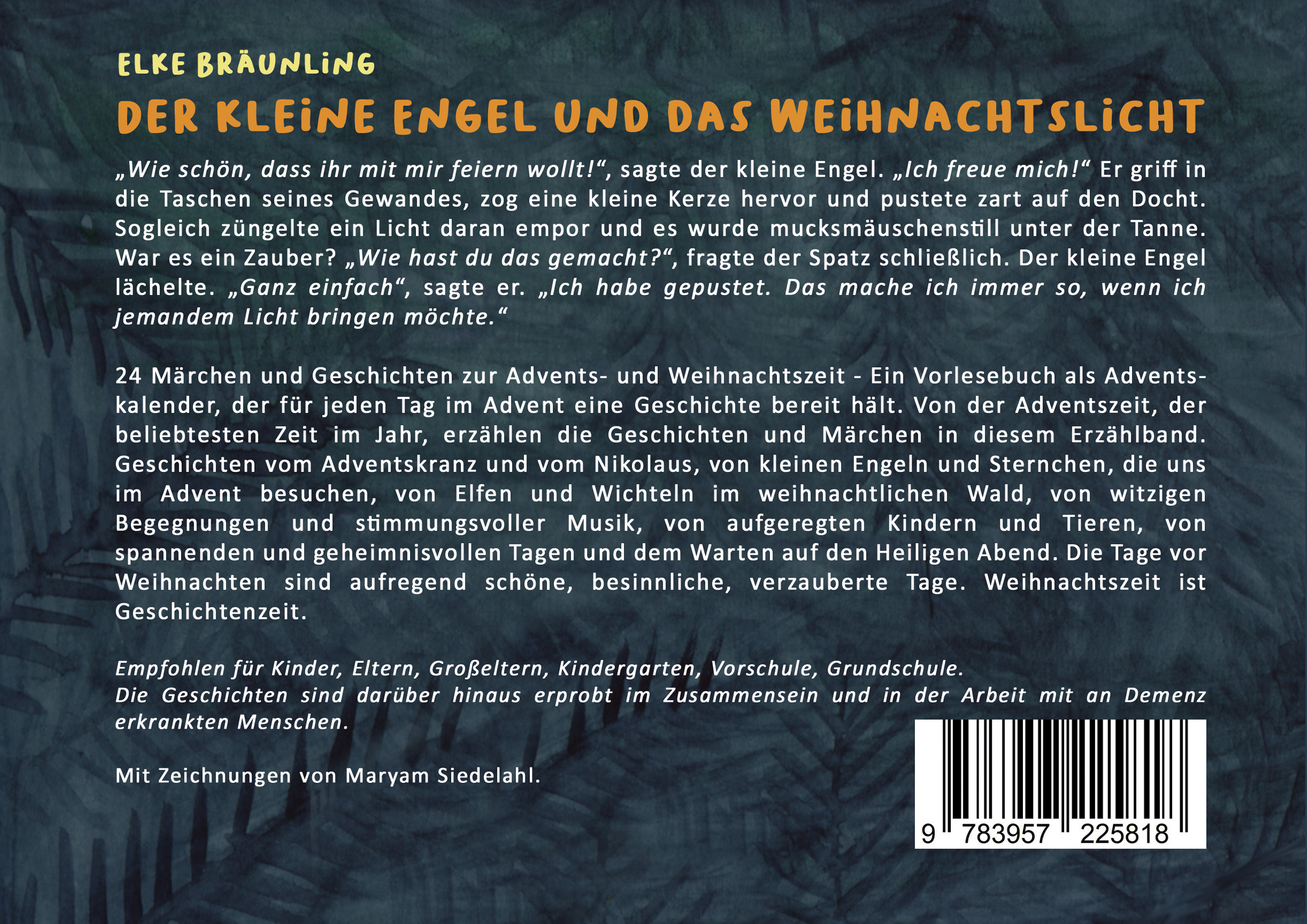 24 Vorlesegeschichten im Advent. "Wie schön, dass ihr mit mir feiern wollt!", sagte der kleine Engel. "Ich freue mich!" Er griff in die Taschen seines Gewandes, zog eine kleine Kerze hervor und pustete zart auf den Docht. Sogleich züngelte ein Licht daran empor und es wurde mucksmäuschenstill unter der Tanne. War es ein Zauber? "Wie hast du das gemacht?", fragte der Spatz schließlich. Der kleine Engel lächelte. "Ganz einfach", sagte er. "Ich habe gepustet. Das mache ich immer so, wenn ich jemandem Licht bringen möchte." 24 Märchen und Geschichten zur Advents- und Weihnachtszeit - Ein Vorlesebuch als Adventskalender, der für jeden Tag im Advent eine Geschichte bereit hält. Von der Adventszeit, der beliebtesten Zeit im Jahr, erzählen die Geschichten und Märchen in diesem Erzählband. Geschichten vom Adventskranz und vom Nikolaus, von kleinen Engeln und Sternchen, die uns im Advent besuchen, von Elfen und Wichteln im weihnachtlichen Wald, von witzigen Begegnungen und stimmungsvoller Musik, von aufgeregten Kindern und Tieren, von spannenden und geheimnisvollen Tagen und dem Warten auf den Heiligen Abend. Die Tage vor Weihnachten sind aufregend schöne, besinnliche, verzauberte Tage. Weihnachtszeit ist Geschichtenzeit. Empfohlen für Kinder, Eltern, Großeltern, Kindergarten, Vorschule, Grundschule. Die Geschichten sind darüber hinaus erprobt im Zusammensein und in der Arbeit mit an Demenz erkrankten Menschen.