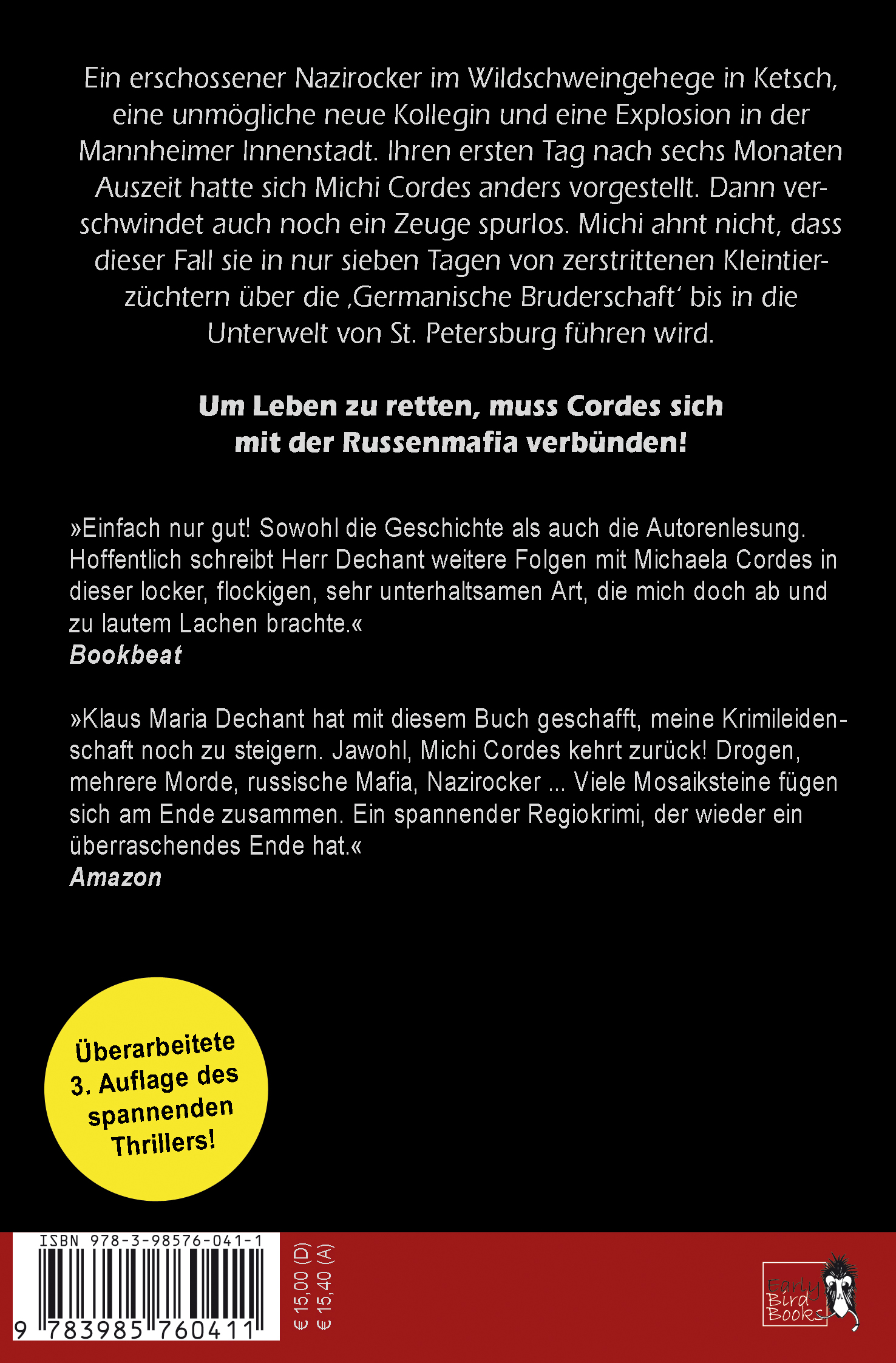 Ein erschossener Nazirocker im Wildschweingehege in Ketsch, eine unmögliche neue Kollegin und eine Explosion in der Mannheimer Innenstadt. Ihren ersten Tag nach sechs Monaten Auszeit hatte sich Michi Cordes anders vorgestellt. Dann verschwindet auch noch ein Zeuge spurlos. Michi ahnt nicht, dass dieser Fall sie in nur sieben Tagen von zerstrittenen Kleintierzüchtern über die ‚Germanische Bruderschaft‘ bis in die Unterwelt von St. Petersburg führen wird.