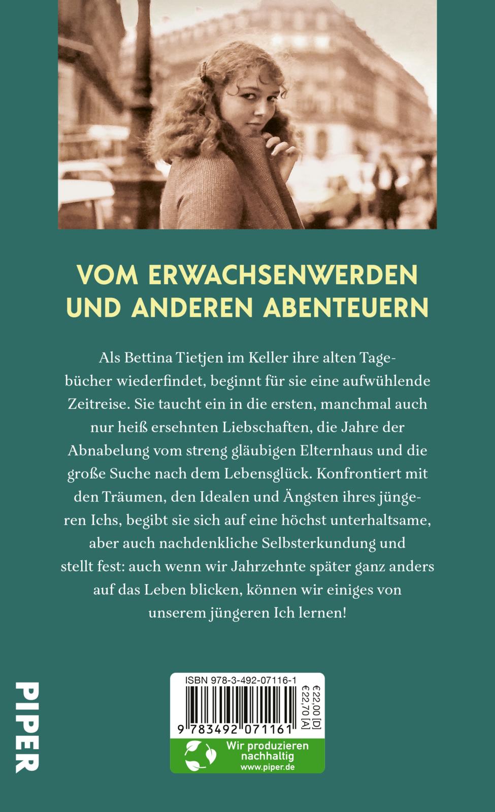 Als Bettina Tietjen im Keller ihre alten Tagebücher wiederfindet, beginnt für sie eine aufwühlende Zeitreise. Sie begegnet ihrem 14-jährigen Ich wieder, das sich leidenschaftlich politisch positioniert, taucht ein in die ersten, manchmal auch nur heiß ersehnten Liebschaften, die Jahre der Abnabelung vom streng gläubigen Elternhaus und die große Suche nach dem Lebensglück. Konfrontiert mit den Träumen, den Idealen und Ängsten ihres jüngeren Ichs, begibt sich die heute einundsechzigjährige Moderatorin, Autorin und Talkmasterin auf eine höchst unterhaltsame, aber auch nachdenkliche Selbsterkundung und stellt fest: auch wenn wir Jahrzehnte später ganz anders auf das Leben blicken, können wir einiges von unserem jüngeren Ich lernen!