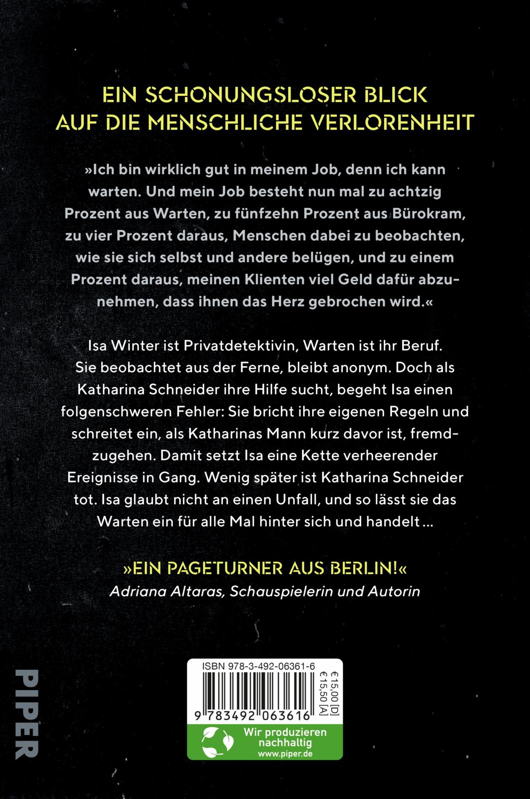 »Mein Name ist Isadora Winter. Ich bin 35 Jahre alt, habe einen fünfzehnjährigen Sohn und arbeite seit sieben Jahren als Privatdetektivin in Berlin. Mein Job besteht zu achtzig Prozent aus Warten, zu fünfzehn Prozent aus Bürokram, zu vier Prozent daraus, Menschen dabei zu beobachten, wie sie sich selbst und andere belügen, und zu einem Prozent daraus, meinen Klienten viel Geld dafür abzunehmen, dass ihnen das Herz gebrochen wird.«