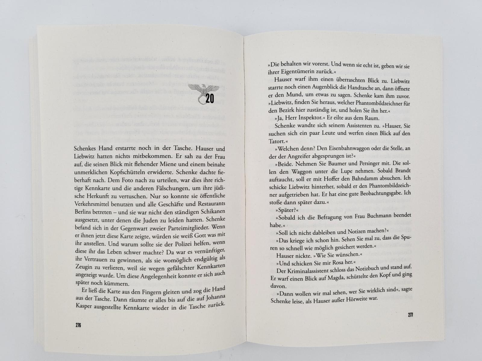 Seine Weigerung, in die Nazipartei einzutreten, bringt ihn in große Gefahr - und als eine zweite Frau ermordet wird, entdeckt Schenke eine Spur, die bis ins Zentrum der Macht führt. Seine Stunden scheinen gezählt.
