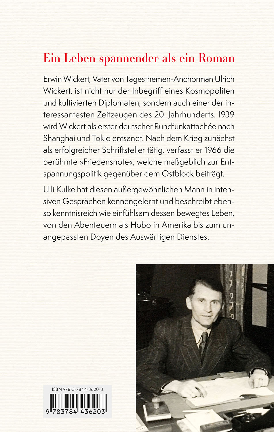 Erwin Wickert (1915-2008), Vater von Tagesthemen-Anchorman Ulrich Wickert, war der Inbegriff des kosmopolitischen und kultivierten Diplomaten und einer der interessantesten Zeitzeugen des 20. Jahrhunderts. 1939 wurde Wickert als erster deutscher Rundfunkattachée nach Tokio und Shanghai entsandt, er war erfolgreicher Schriftsteller und 1966 Verfasser der berühmten "Friedensnote", die die Entspannungspolitik gegenüber dem Ostblock mit einleitete. Ulrich Kulke hat diesen außergewöhnlichen Mann in intensiven Gesprächen persönlich kennengelernt und beschreibt sein bewegtes Leben, von den Abenteuern als Hobo in Amerika bis zum unangepassten Doyen des Auswärtigen Dienstes.