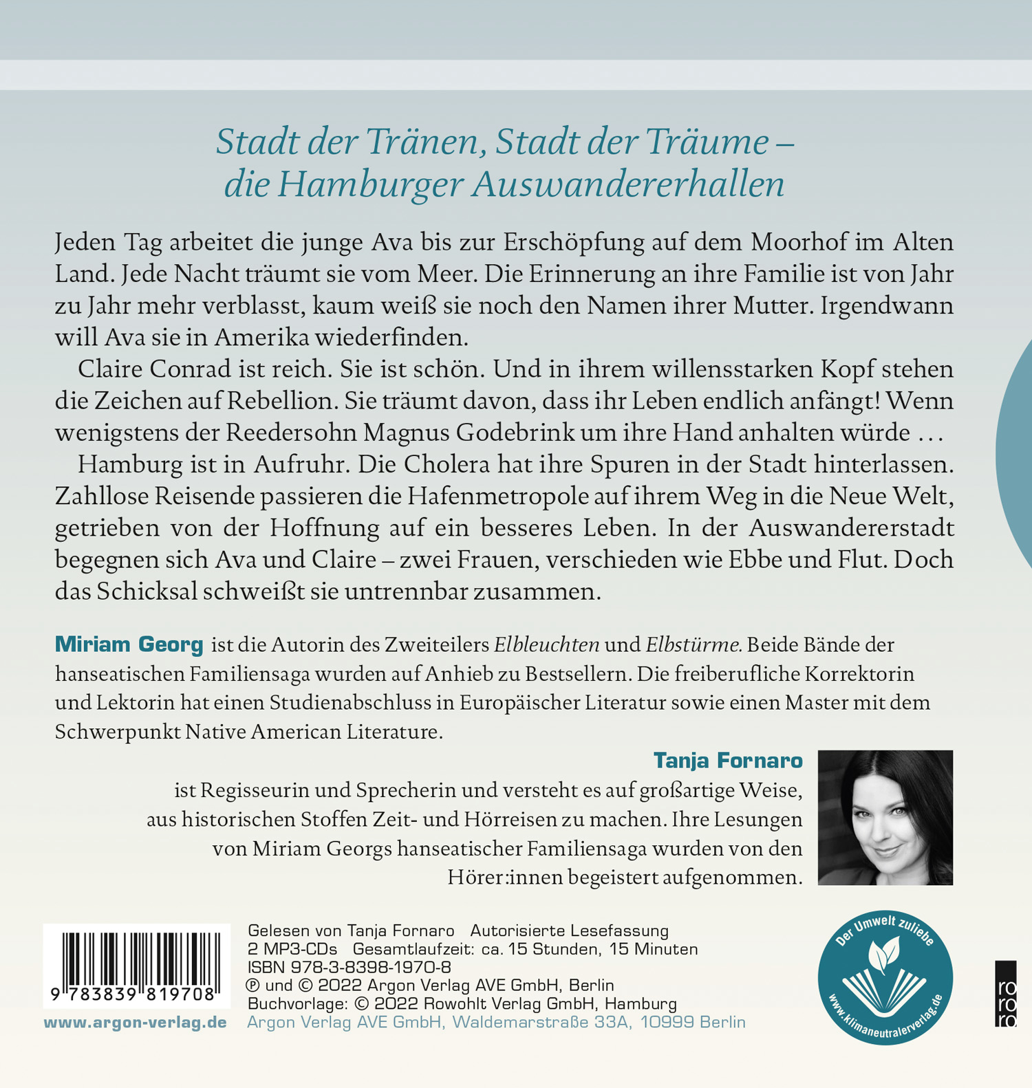 | Schlagworte | Albert Ballin • Amerika • Auswanderer • Auswandererhallen • Auswanderung • BallinStadt • Carmen Korn • Einwanderung • Elbleuchten • Familengeschichte • Gesellschaft • Gesellschaftsroman • Hafen • Hamburg • Hamburger Hafen • Hanseatische Familiensaga • Historischer Roman • Liebesroman • Migration • Neuanfang • Romane Neuerscheinungen 2022 • spiegel bestseller • Spiegel Bestseller 2022 • Spiegel Bestseller 2023 • Spiegel Bestsellerliste 2022 • Veddel |