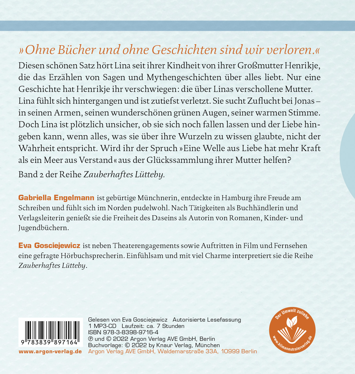 | Schlagworte | Die Liebe tanzt barfuß am Strand • Dorfgemeinschaft • Dorfleben • Familie • Familiengeheimnis • feel good Roman • Fehde • Freundschaft • Gabriella Engelmann • Gemeinschaft • Geschenk Freundin • Hörbücher Frauenromane • Hörbuch Nordsee • Hörbuch-Serie • Intrige • Kleinstadt • Küste • Küstenroman • Liebe • Liebesgeschichte • Lütteby • Meer • Nordsee • regional • Reihe • Romane Neuerscheinungen 2022 • Spuklegende • Trilogie • Urlaub in Deutschland • Urlaubslektüre • Wohlfühlroman • Zusammenhalt |
