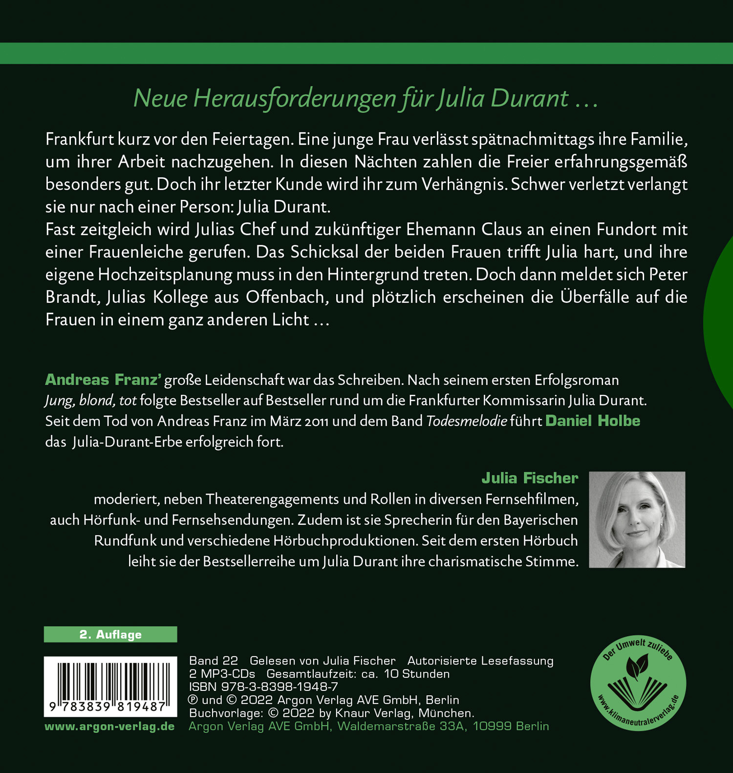 Zum 22. Mal bereits ermittelt die Frankfurter Kommissarin Julia Durant in einem nervenzerfetzenden Fall. Ein Muss für alle Fans von Andreas Franz und Daniel Holbe.