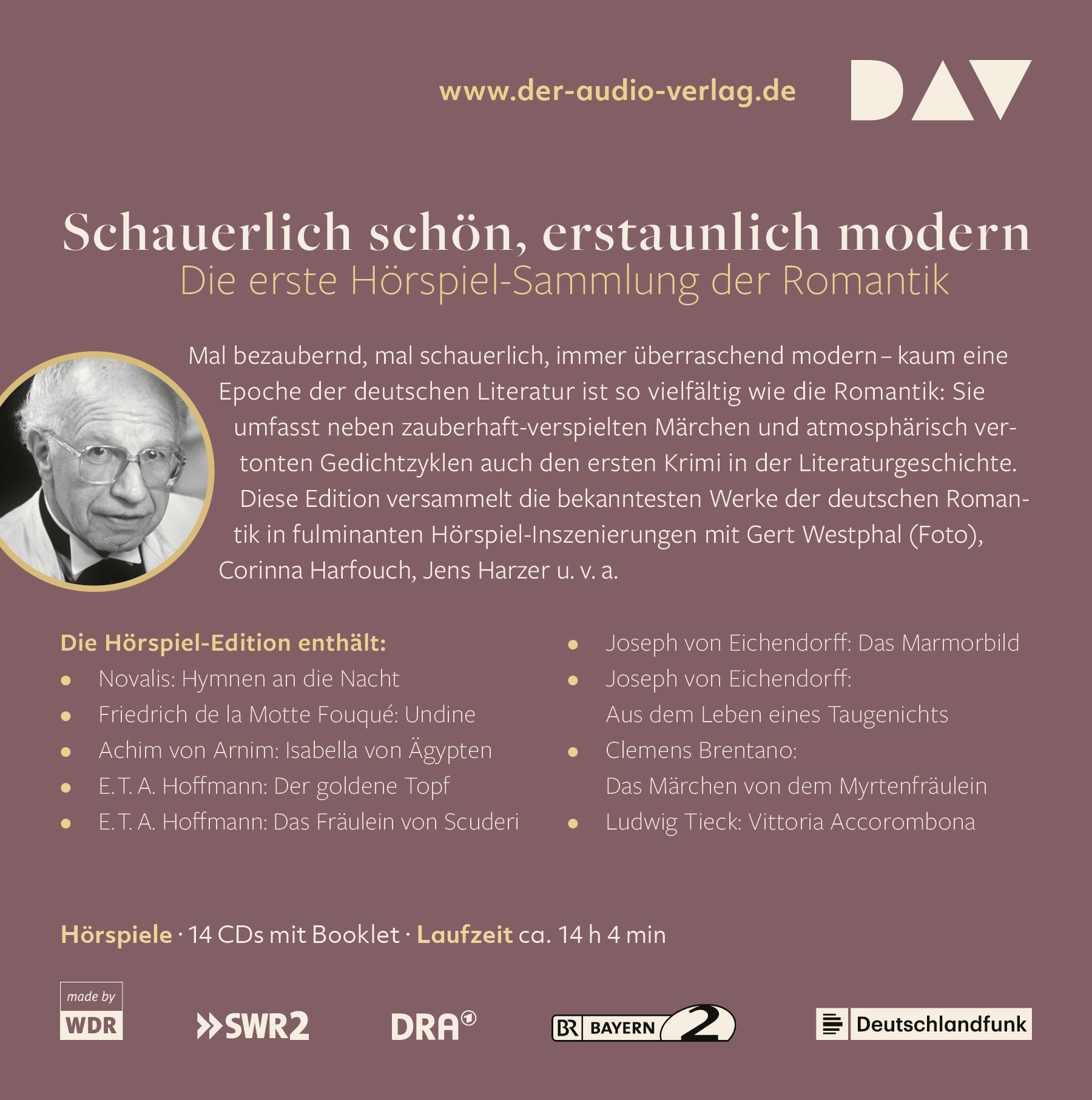 Mal zauberhaft, mal schauerlich, immer überraschend modern – kaum eine Epoche der deutschen Literatur ist so vielfältig wie die Romantik. Es entstanden sowohl die ersten Detektivgeschichten als auch viele der schönsten Märchen. Die Beschäftigung mit solch scheinbar gegensätzlichen Themen ist der Kern dieser Epoche: Romantische Schriftsteller suchten das Einzigartige im Geläufigen; das Mystische im Alltäglichen; das Bezaubernde im Schauerlichen. Diese Hörspiel-Edition bietet einen Einblick in die das Schaffen der bekanntesten deutschen Romantiker: zauberhaft-verspielte Märchen, spannende Mordfälle und atmosphärisch vertonte Gedichtzyklen.
