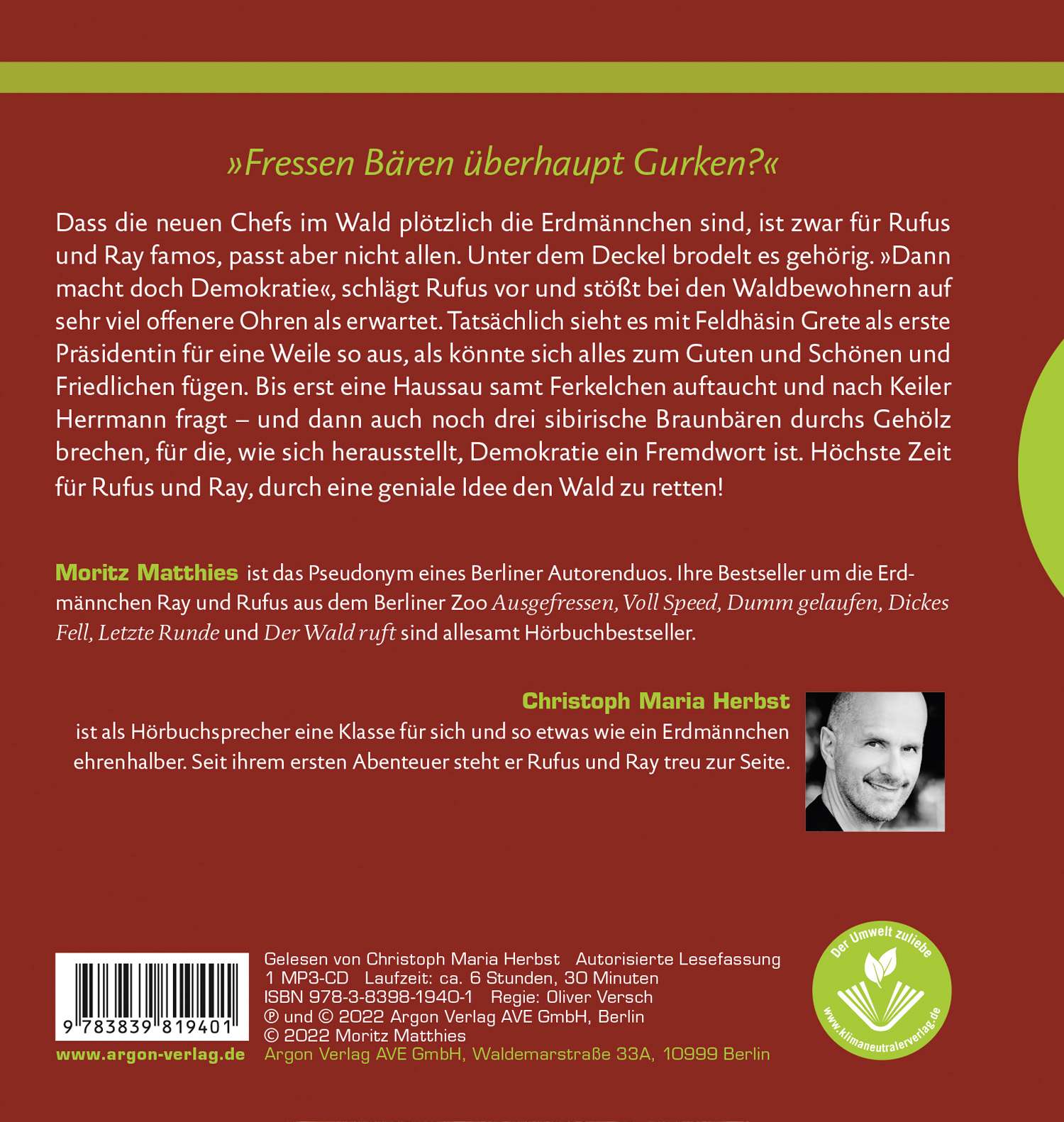 | Schlagworte | Ausgefressen • Band 7 • Berlin • Christoph Maria Herbst • Comedy • Der Wald ruft • Dumm gelaufen • Edgar Rai • Erdmännchen Band 7 • Erdmännchen-Brüder • Erdmännchen-Clan • Familienhörbuch • Hans Rath • Humor • Känguru-Chroniken • Krimi Neuerscheinungen 2022 • Personifikation • Rath und Rai • Ray, Rufus, Rocky • spiegel bestseller • Spiegel Bestseller 2022 • Spiegel Bestsellerliste 2022 • Tierkrimi • Tierroman • Urlaubslektüre • Waldtiere |