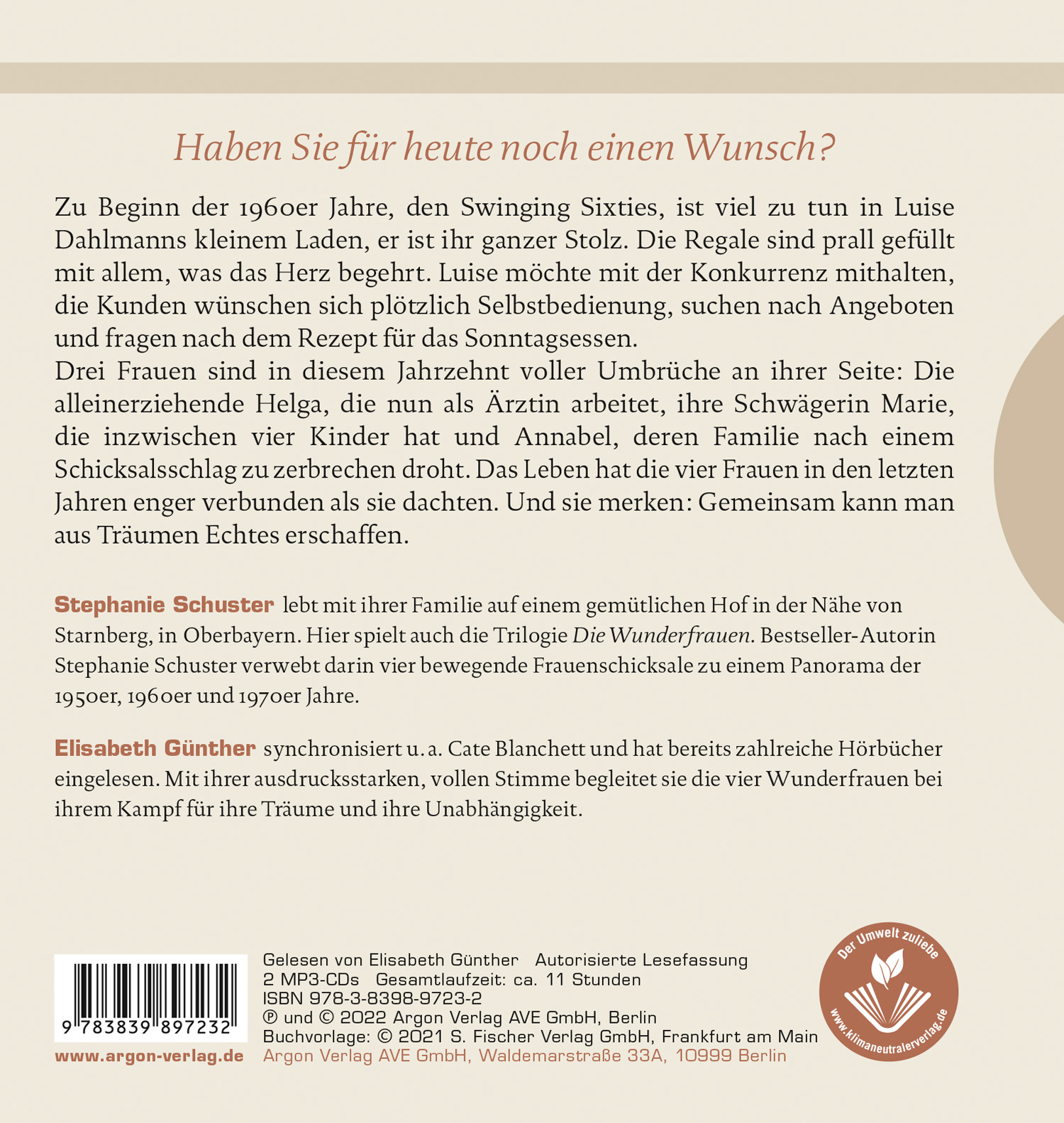 | Schlagworte | 1950er Jahre • Brigitte Riebe • Carmen Korn • Frauengeschichte deutschland • Frauenschicksal • Freundinnen • Geburtshilfe • Geschenk für Frauen • Hippie-Zeit • Hörbuch für Frauen • Hörbuch Nachkriegsdeutschland • Hörbuch über 1950er Jahre • Hörbuch über Wirtschaftswunder • Hörbuch Wunderfrauen • Internationaler Frauentag • Ku'damm 56 • Lebensmittelgeschäft • Miriam Georg • Mondlandung • Nachkriegsdeutschland • Nachkriegsgeschichte • Nachkriegsjahre • Nachkriegszeit • Pille • Romane Neuerscheinungen 2022 • Starke Frauen • Tante-Emma-Laden • tanzcafé • Verhütung • Wirtschaftswunder Roman • Wunderfrauen Hörbuch • Wunderfrauen-Trilogie • Zeitgeschichte Hörbuch |