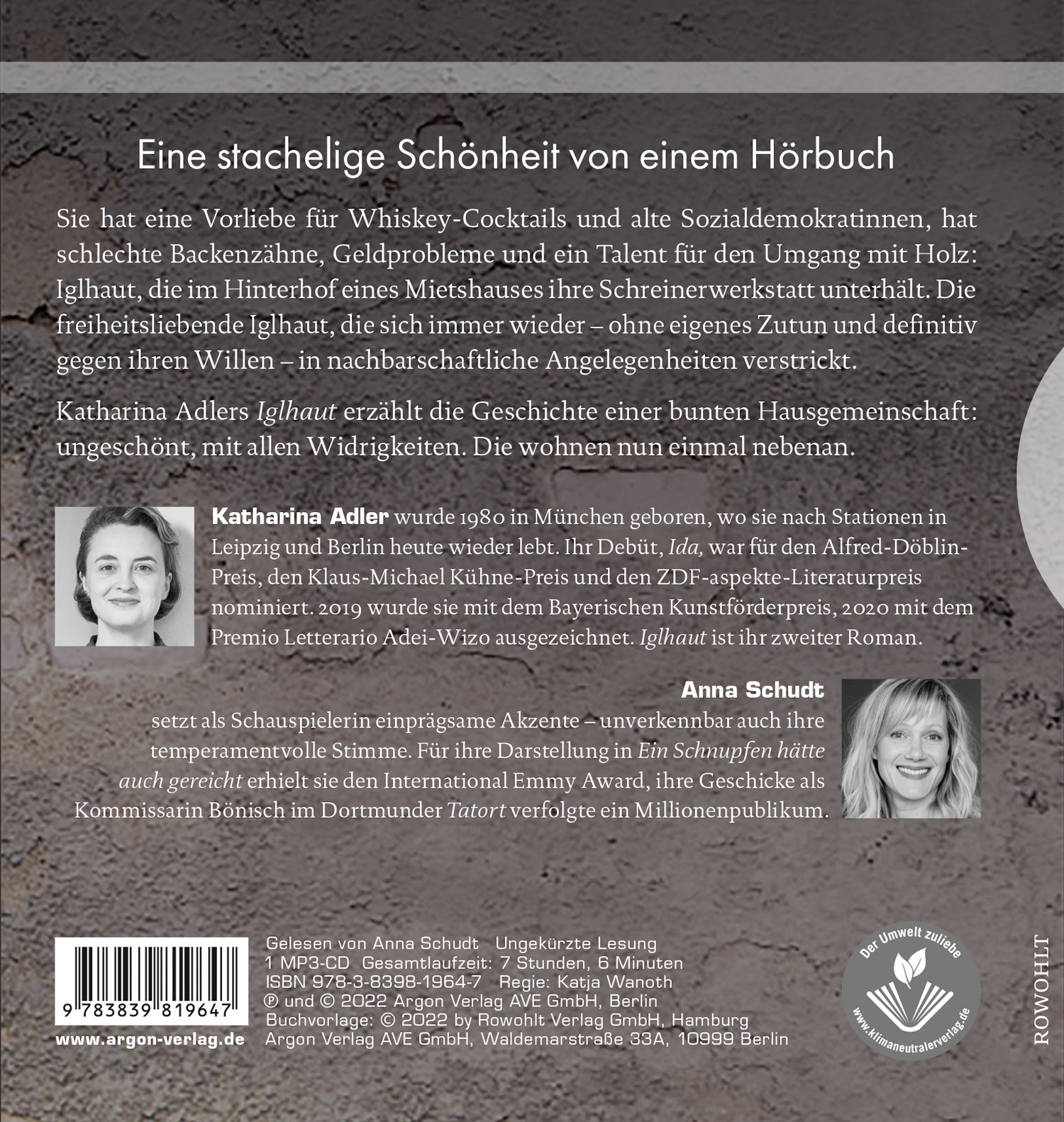 Katharina Adler wurde 1980 in München geboren, wo sie nach Stationen in Leipzig und Berlin heute wieder lebt. Ihr Debüt, "Ida", war für den Alfred-Döblin-Preis, den Klaus-Michael Kühne-Preis und den ZDF-aspekte-Literaturpreis nominiert. 2019 wurde sie mit dem Bayerischen Kunstförderpreis, 2020 mit dem Premio Letterario Adei-Wizo ausgezeichnet. "Iglhaut" (2022) ist ihr zweiter Roman.
