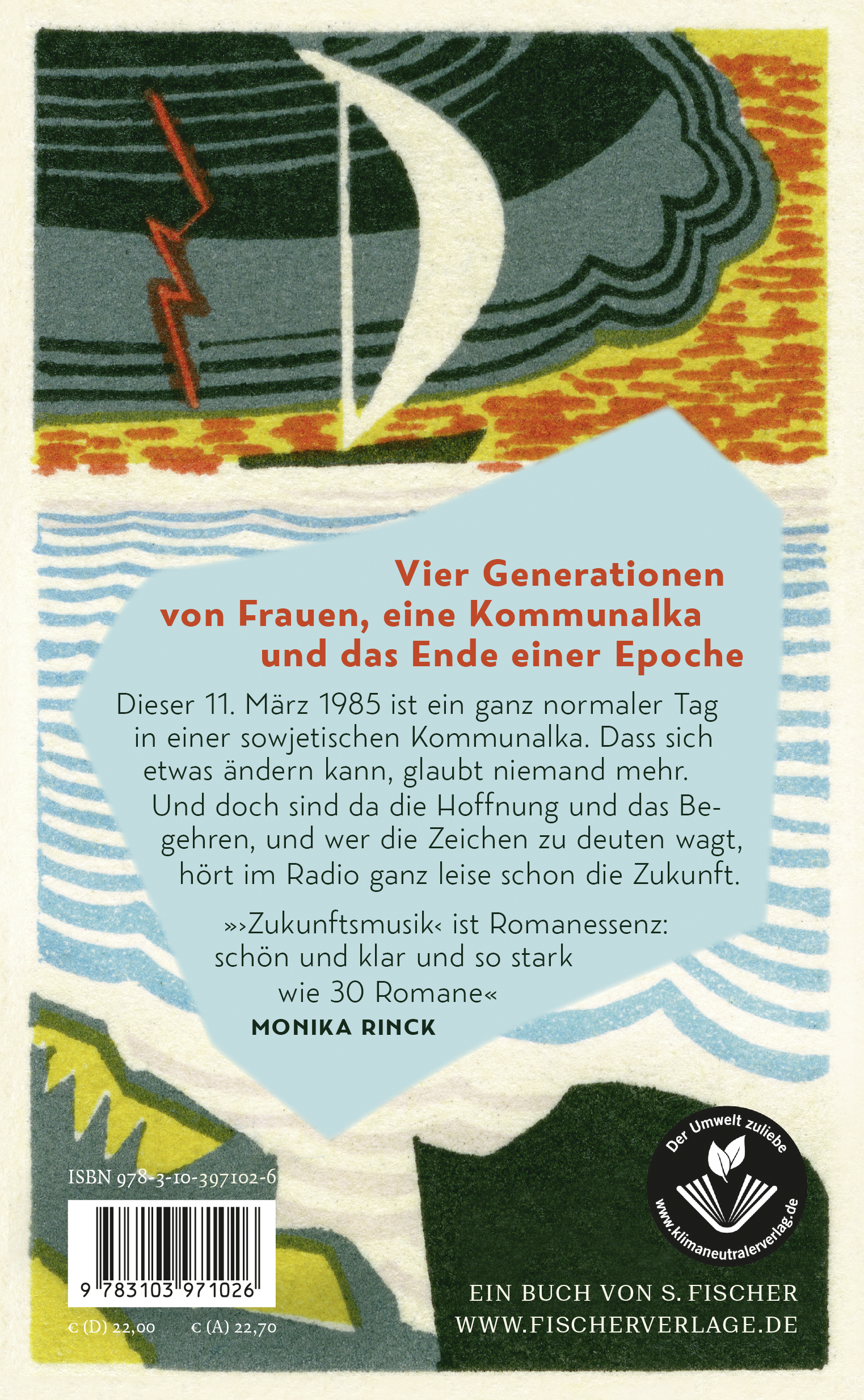 »Zukunftsmusik« ist ein großer Roman über vier Leben am Wendepunkt, über eine untergegangene Welt, die bis heute nachwirkt, über die Absurdität des Daseins und die große Frage des Hier und Jetzt: Was tun? Der neue Roman von Katerina Poladjan über vier Generationen von Frauen, eine Kommunalka und das Ende einer Epoche. Der neue Roman einer großen europäischen Autorin, die vom Gestern erzählt, aber vom Heute spricht.
