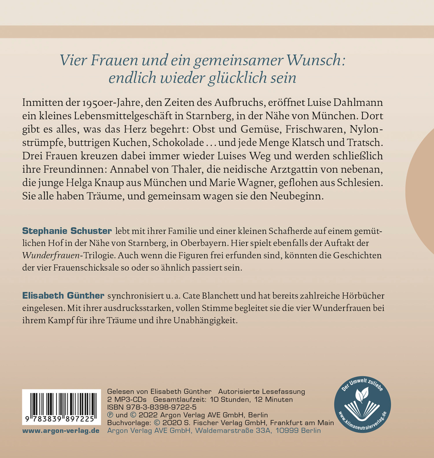 Elisabeth Günther synchronisiert unter anderem Cate Blanchett und hat bereits zahlreiche Hörbücher eingelesen. Mit ihrer ausdrucksstarken, vollen Stimme begleitet sie nun die vier Wunderfrauen bei ihrem Kampf für ihre Träume und ihre Unabhängigkeit.