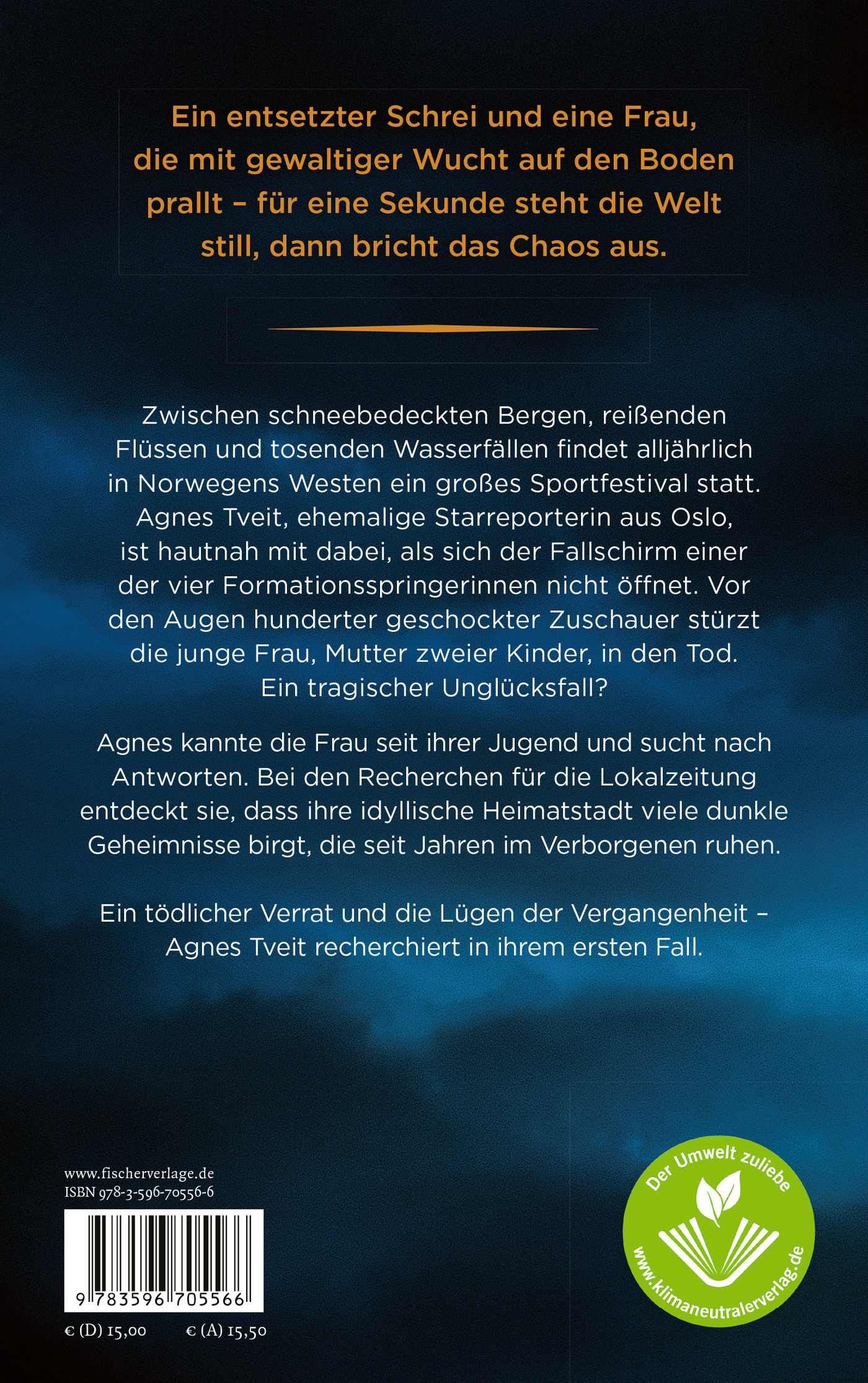 Agnes Tveit, ehemalige Starreporterin aus Oslo, ist hautnah mit dabei, als sich der Fallschirm einer der vier Springerinnen nicht öffnet. Vor den Augen hunderter geschockter Zuschauer stürzt die junge Frau, Mutter zweier Kinder, in den Tod.