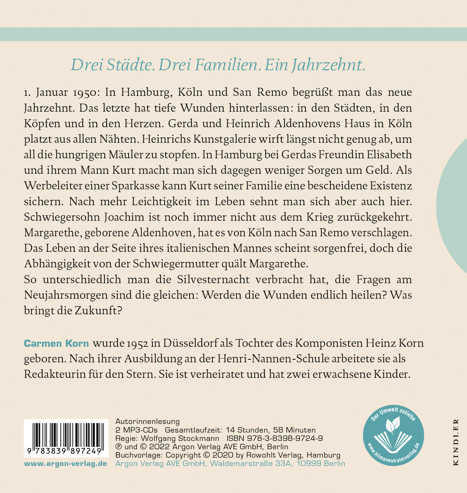 | Schlagworte | 50er Jahre • Aufbruchsjahre • Autorinnenlesung • Bestseller Hörbuch • Bundesrepublik • Deutschland • Familiengeschichte • Familienroman • Familiensaga • Hamburg • Hörbuch für Frauen • Internationaler Frauentag • Italien • Jahrhundert-Trilogie • Köln • Nachkriegsdeutschland • Nachkriegsgeschichte • Nachkriegsjahre • Nachkriegszeit • Romane Neuerscheinungen 2022 • San Remo • spiegel bestseller • Spiegel Bestseller 2022 • Spiegel Bestseller Autorin • Spiegel Bestsellerliste 2022 • Starke Frauen • Töchter einer neuen Zeit • Wirtschaftswunder • Zeitgeschichte |
