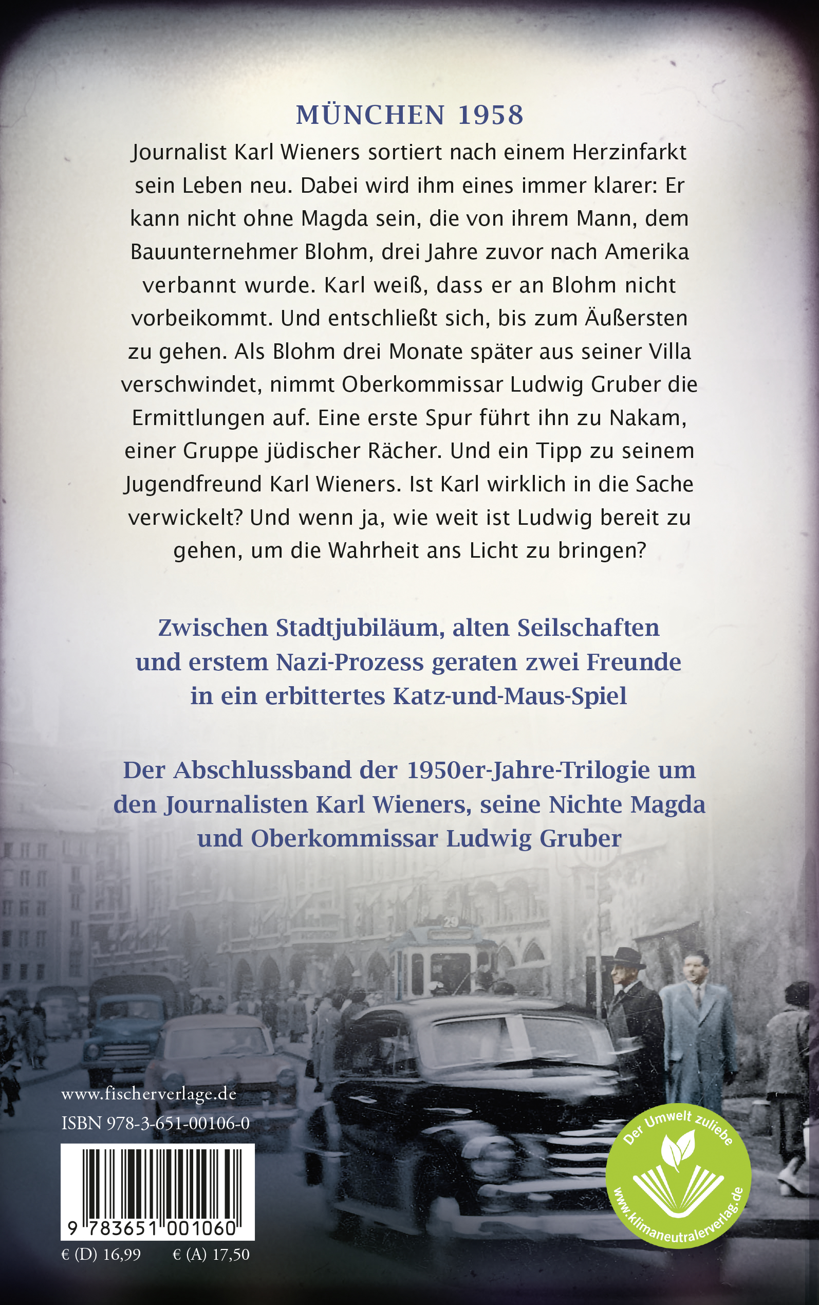 München 1958. Zwischen Stadtjubiläum, alten Seilschaften und erstem Nazi-Prozess geraten zwei Freunde in ein erbittertes Katz-und-Maus-Spiel - der Abschlussband der 1950er-Jahre-Trilogie um den Journalisten Karl Wieners, seine Nichte Magda und Oberkommissar Ludwig Gruber