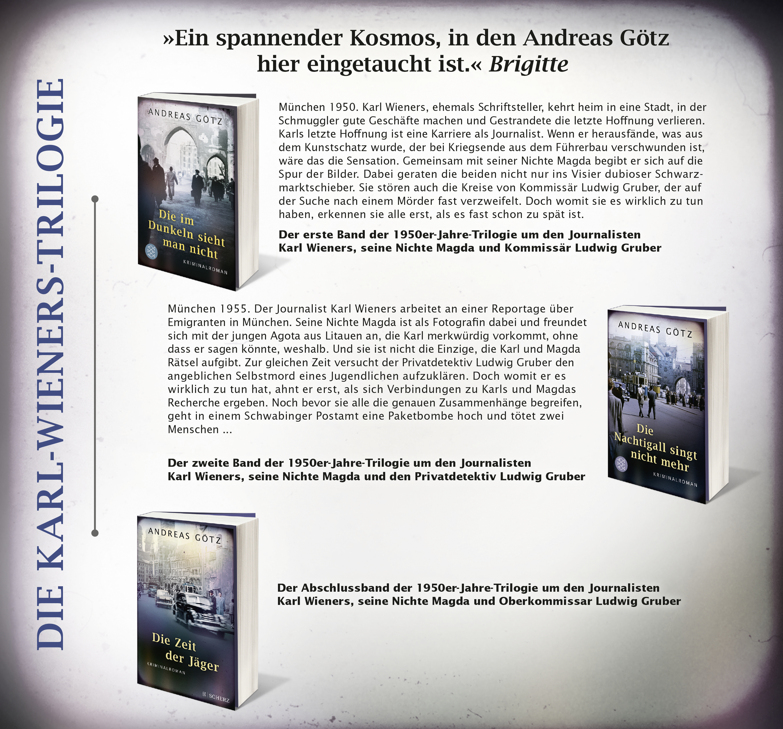 Ursprünglich wollte Andreas Götz seine Kriminalromane in der Nazi-Zeit ansiedeln. Doch bei der Recherche wurde ihm schnell klar, dass sich die 1950er Jahre viel besser eignen. Ein gesellschaftliches Klima von Schuld, Verdrängung und Selbstbetrug, wie es in dieser Zeit herrschte, bringt alle Voraussetzungen mit, die ein fesselnder Roman braucht. Der Handlungsort München hat sich nicht zuletzt deshalb aufgedrängt, weil Andreas Götz ganz in der Nähe als freier Autor lebt und arbeitet und daher Land und Leute gut kennt. Seine Trilogie umfasst die Jahre 1950, 1955 und 1958.