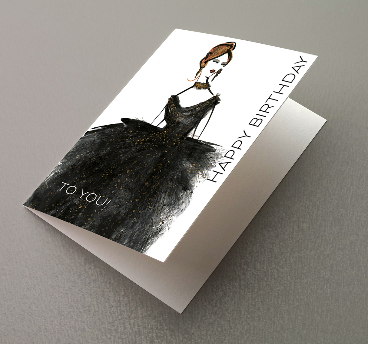 Edle Geburtstagskarte mit Modeillustration, hochwertig veredelt mit Goldfolie, gedruckt auf feinstem Papier, mit gefüttertem Briefkuvert.