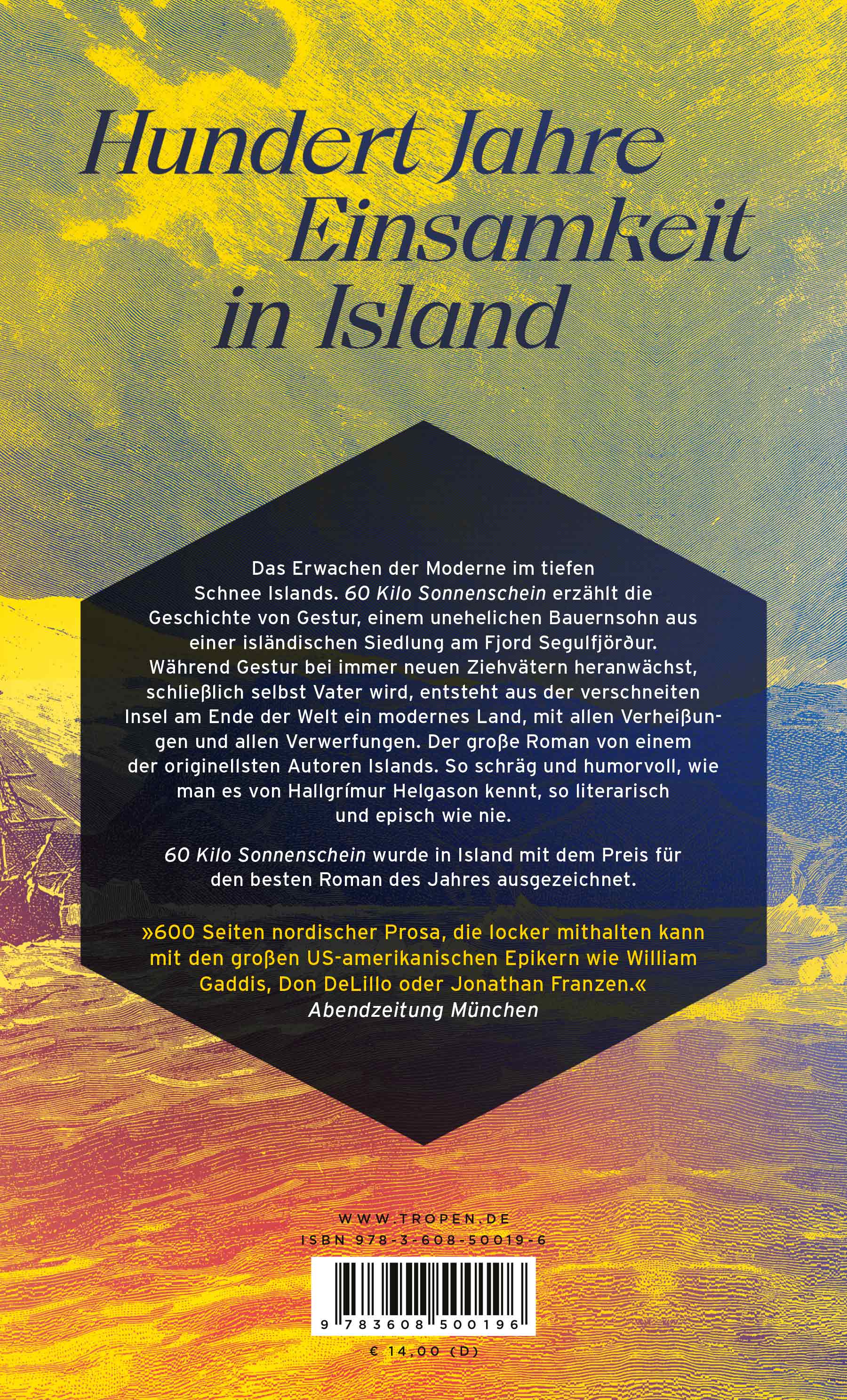 lt;p>Das Erwachen der Moderne im tiefen Schnee Islands. 60 Kilo Sonnenschein erzählt die Geschichte von Gestur, einem unehelichen Bauernsohn aus einer isländischen Siedlung am Fjord Segulfjörður. Während Gestur bei immer neuen Ziehvätern heranwächst, schließlich selbst Vater wird, entsteht aus der verschneiten Insel am Ende der Welt ein modernes Land, mit allen Verheißungen und allen Verwerfungen. Der große Roman von einem der originellsten Autoren Islands. So schräg und humorvoll, wie man es von Hallgrímur Helgason kennt, so literarisch und episch wie nie.