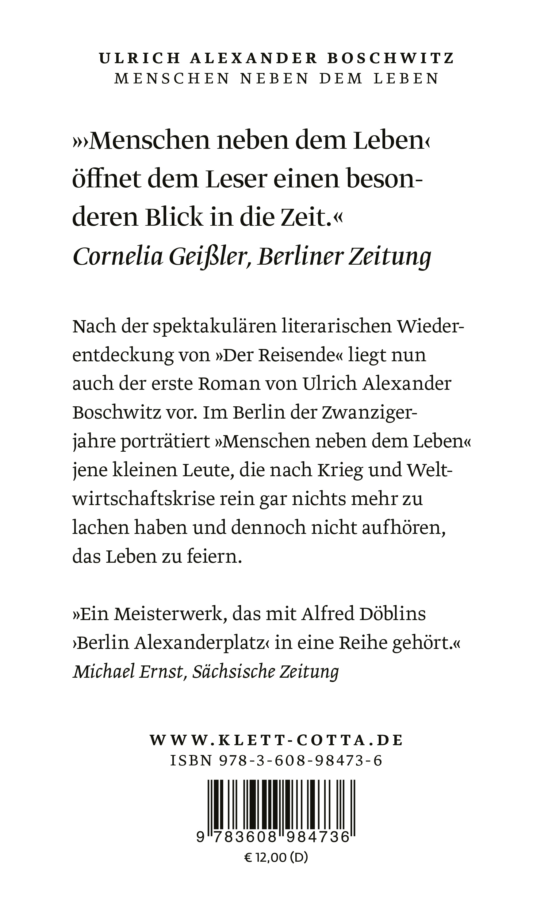 Nach der spektakulären literarischen Wiederentdeckung von »Der Reisende« erscheint nun der erste Roman von Ulrich Alexander Boschwitz zum ersten Mal im Taschenbuch. Im Berlin der Zwanzigerjahre porträtiert »Menschen neben dem Leben« jene kleinen Leute, die nach Krieg und Weltwirtschaftskrise rein gar nichts mehr zu lachen haben und dennoch nicht aufhören, das Leben zu feiern.