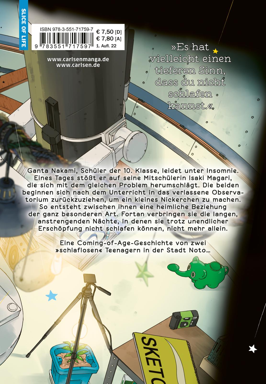 Ganta ist mit seiner stets gereizten Art bei seinen Mitschüler*innen extrem unbeliebt. Niemand ahnt jedoch, dass seine üble Laune auf eine Schlafstörung zurückzuführen ist. Nacht für Nacht liegt er hellwach in seinem Bett und bekommt kein Auge zu. Doch alles ändert sich, als er bei den Vorbereitungen für das Schulfest auf das verlassene Observatorium stößt. Die Ruhe und Abgeschiedenheit machen den Ort zum idealen Schlafplatz - wäre da nicht die Tatsache, dass seine Klassenkameradin Isaki Magari bereits dort schläft! Im Gegensatz zu Ganta ist Isaki eine überaus fröhliche Natur und in der Schule bei allen beliebt. Doch die beiden verbindet dasselbe Problem: Sie leiden an Schlaflosigkeit. Um ihren neuen Schlafplatz nicht zu verlieren, gründen sie einen Astronomieclub und stoßen dabei auf neue Hobbys. Zwischen Sternenbildern, Fotografie und neuen Bekanntschaften kommen sich die beiden immer näher.