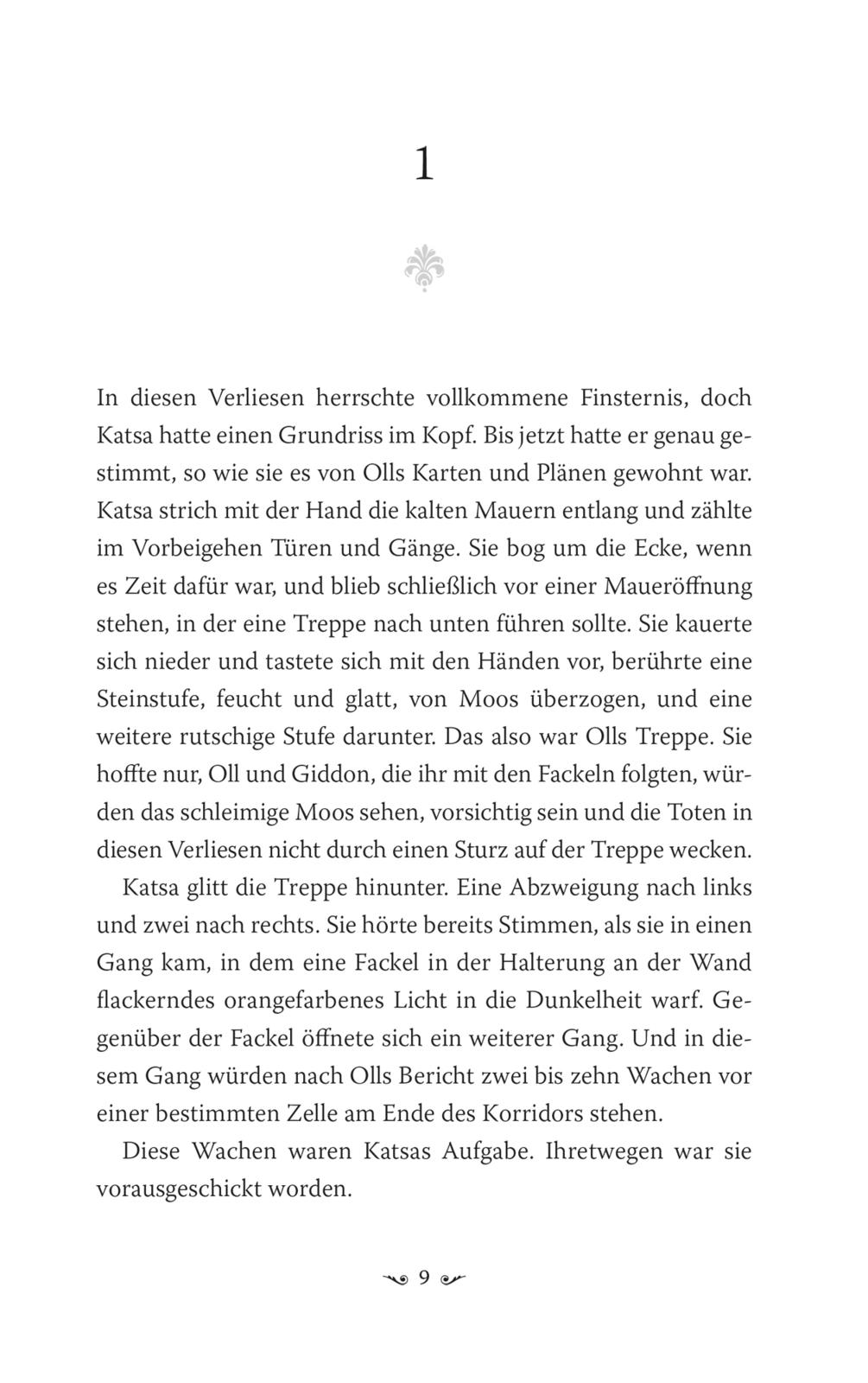 Seine Augen! Nie hatte Katsa solche Augen gesehen. Eins war silbern, das andere golden. Sie leuchteten ungleichmäßig und seltsam in seinem sonnengebräunten Gesicht. Katsa war überrascht, dass sie bei ihrer ersten Begegnung in der Dunkelheit nicht geleuchtet hatten. Katsa konnte nicht aufhören, sie anzusehen. Ihr war bewusst, dass sie mitten im Schlosshof stand und diesen Prinzen von Lienid anstarrte. Sie wusste, dass sie weitergehen sollte, und merkte, dass sie es nicht konnte. Sie riss ihren Blick von seinen Augen los, schob ihre Taschen höher und zwang sich voran ins Schloss, doch die ganze Zeit war sie sich dieser seltsamen Augen in ihrem Rücken bewusst.