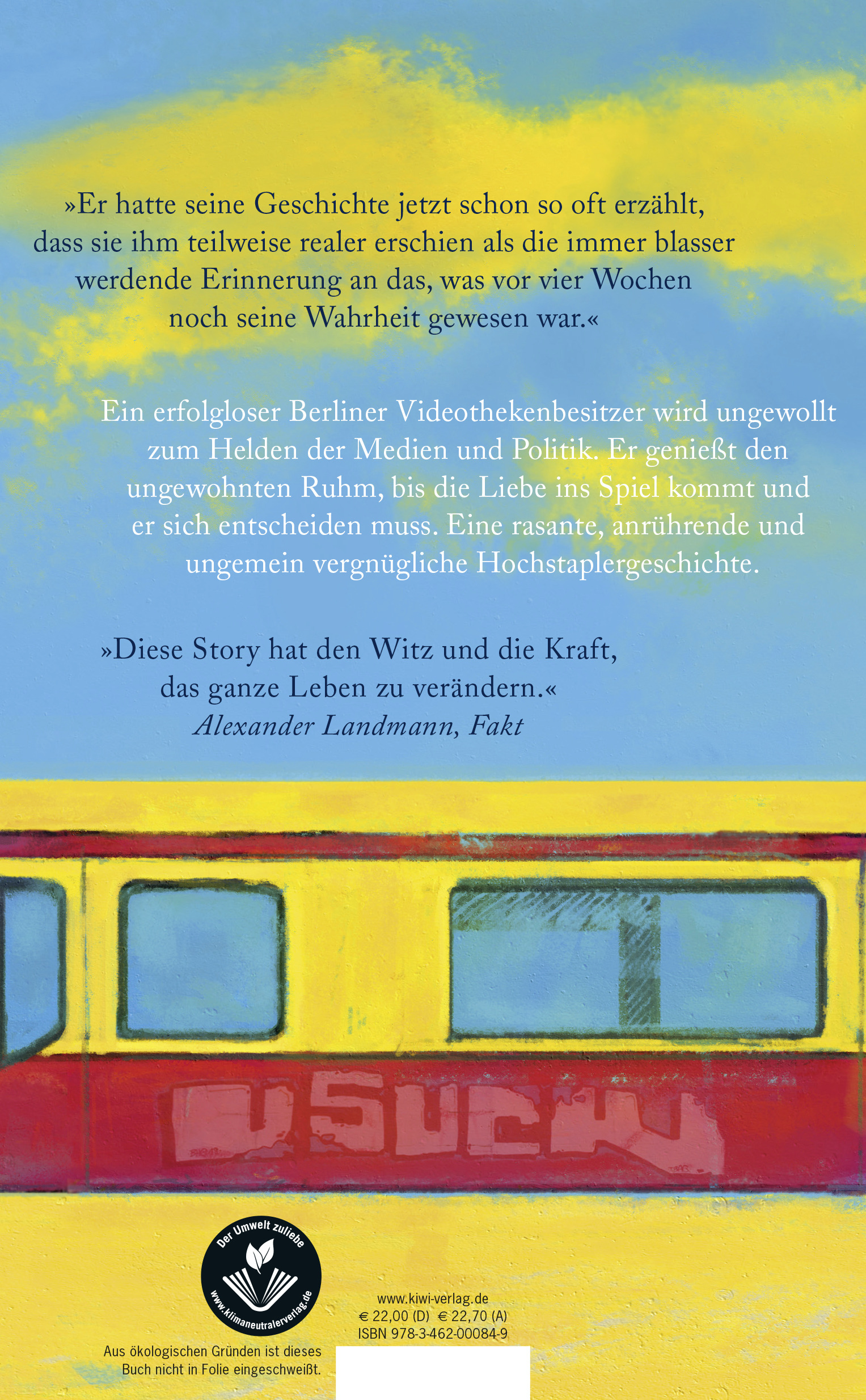 SPIEGEL-Bestseller-Autor Maxim Leo erzählt von einem erfolglosen Berliner Videothekenbesitzer, der ungewollt zum Helden wird. Ein Mann, der den ungewohnten Ruhm genießt, bis die Liebe ins Spiel kommt und er sich entscheiden muss. Eine rasante, anrührende und ungemein vergnügliche Hochstaplergeschichte.