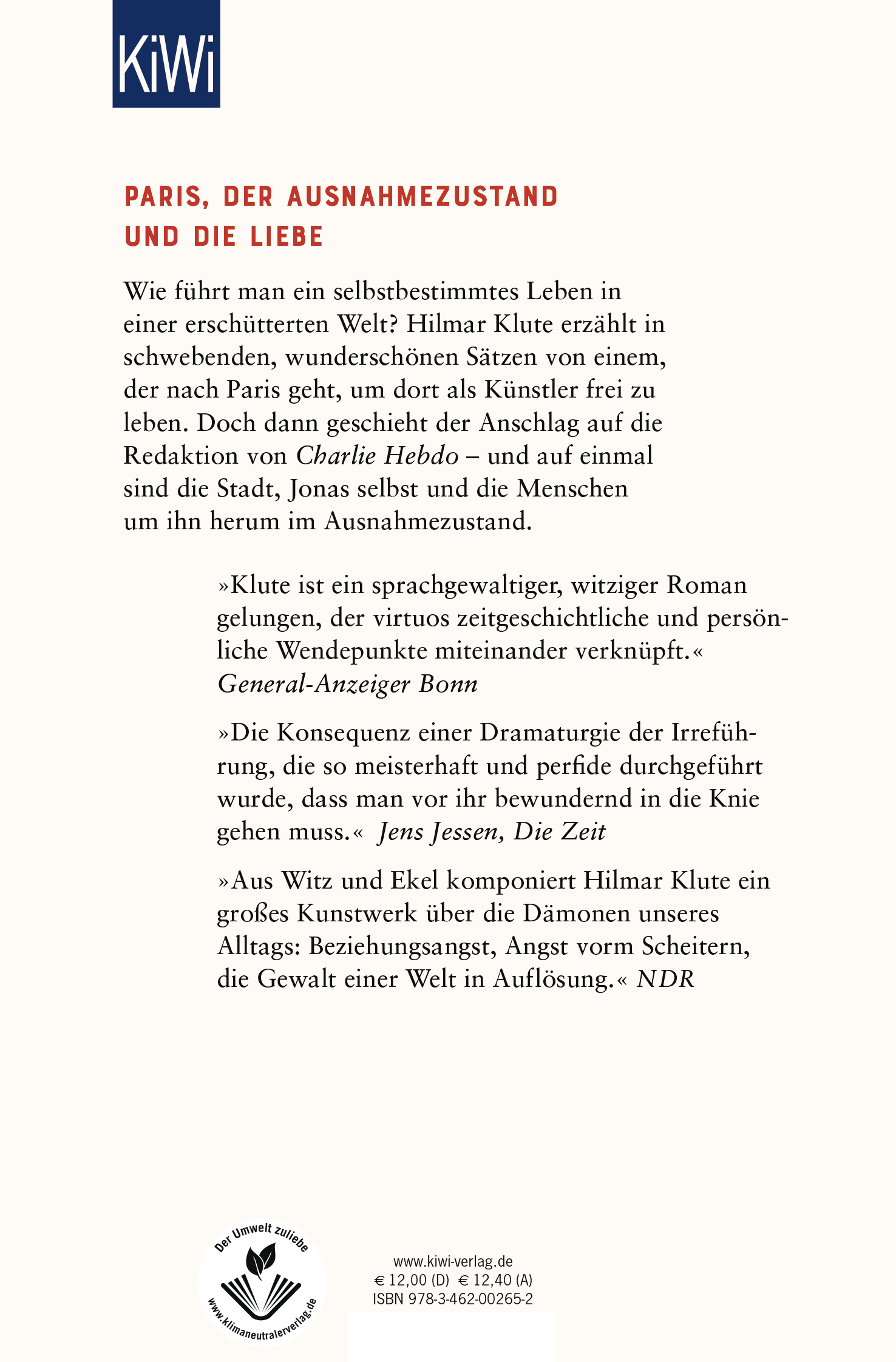 Doch nach dem Attentat auf Charlie Hebdo ist die Stadt plötzlich im Ausnahmezustand und auch bei Jonas droht alle Leichtigkeit zu verfliegen: Ein Brief seiner Ex-Freundin reißt alte Wunden auf, er erfährt vom Tod eines Freundes und auch bei Christine muss er entscheiden, wie ernst er es meint. Als Stein ihn bittet, mit ihm in den USA seinen verschollenen Sohn zu suchen, willigt er ein. Hilmar Klute schickt einen Schöngeist in eine abgründige Welt. In schwebenden Sätzen schreibt er über den Zauber der Literatur und über die Brüchigkeit unserer Existenz.