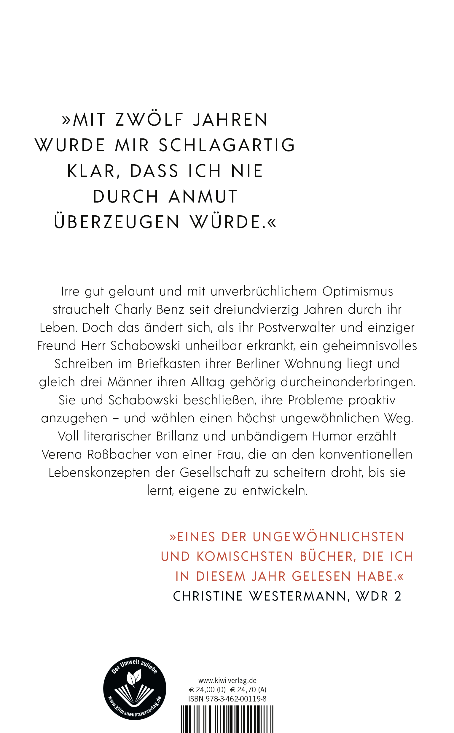 Mit unverbrüchlichem Optimismus und irre gut gelaunt strauchelt Charly Benz seit 43 Jahren durch ihr Leben. Sie arbeitet im Marketing einer Berliner Foodcompany, ernährt sich von angebrannten Croissants und bespricht ihre Beziehungsprobleme - die darin bestehen, dass sie keine Beziehung hat - mit ihrem einzigen Freund: Herr Schabowski, ein sechzigjähriger Mann, der ihre Post und Ängste sortiert.